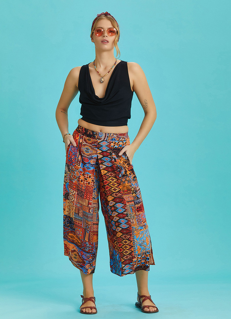 Etnik Desenli, Bohem Tarz, Ön Pilikaşe ve Yan Yırtmaç Detaylı, Arka Bel Lastikli, Cepli, Kapri Boy, Dökümlü, Otantik Kadın Pantolon Etek