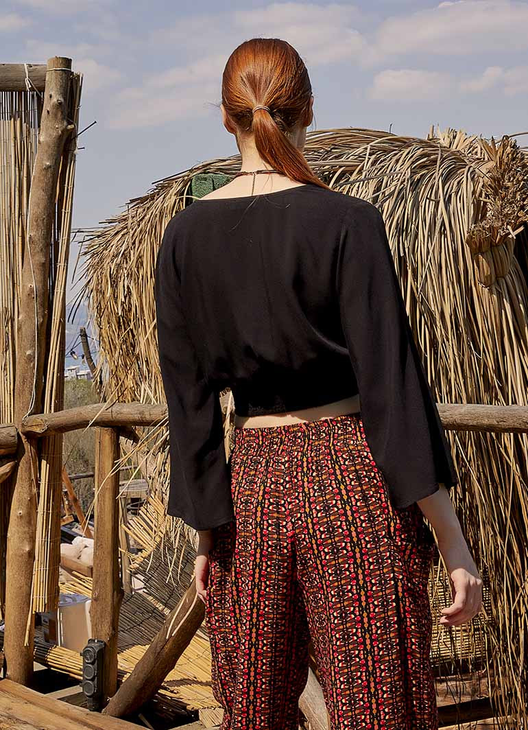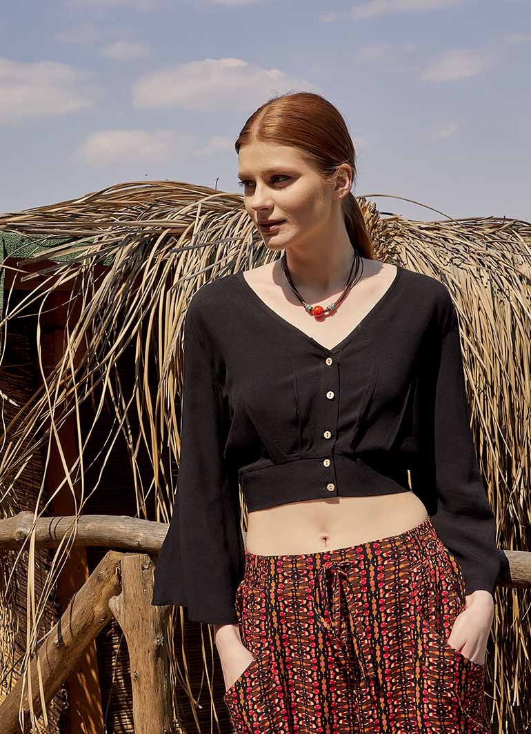 V Yaka, Coconat Düğmeli ,Arkası Büzgülü, Uzun Kollu Bohem Bluz