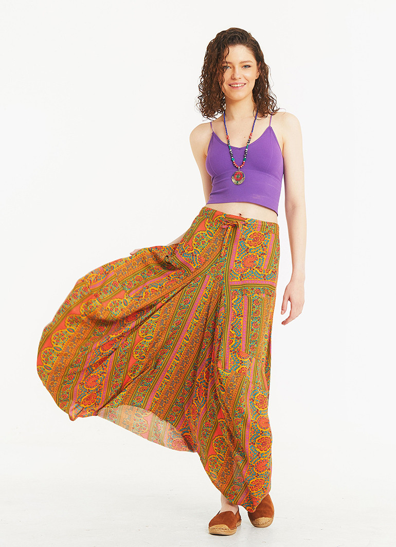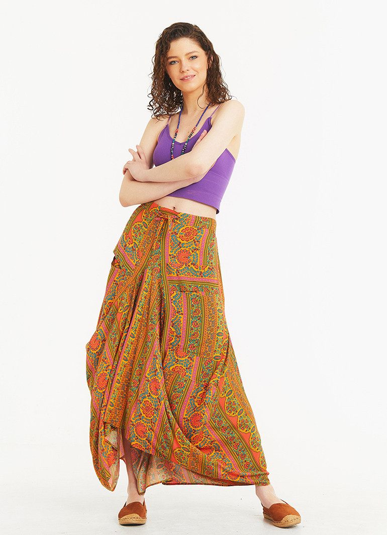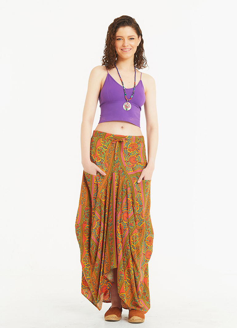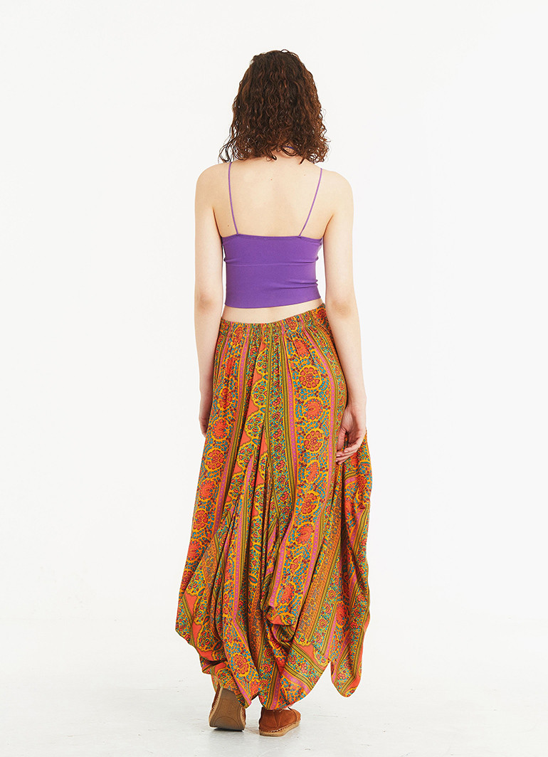 Lastikli, Cep Detaylı, Uzun, Siyah Desenli Asimetrik Etek