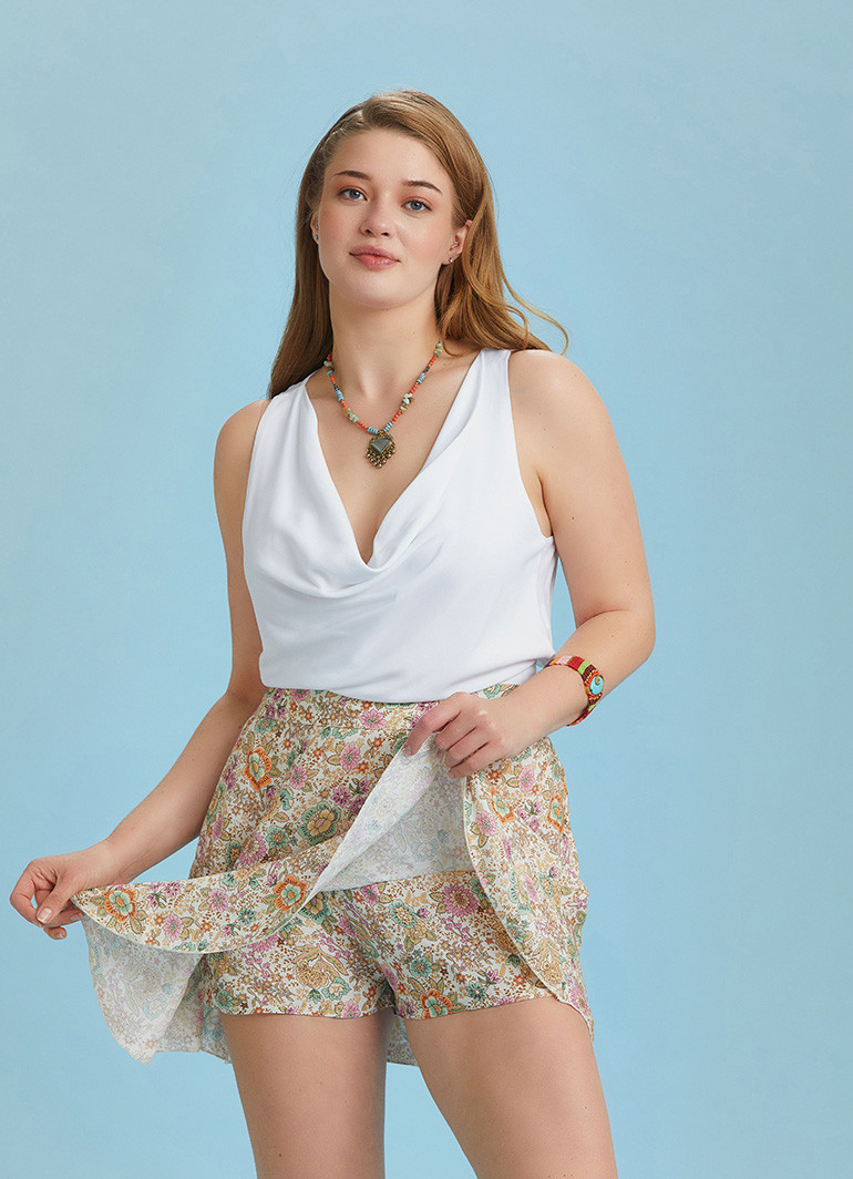 Ön Düz Arka Bel Lastikli, Desenli, Etek Ucu Volanlı, Mini Şort Etek, Büyük Beden Şort Etek