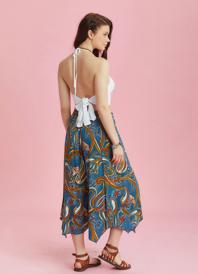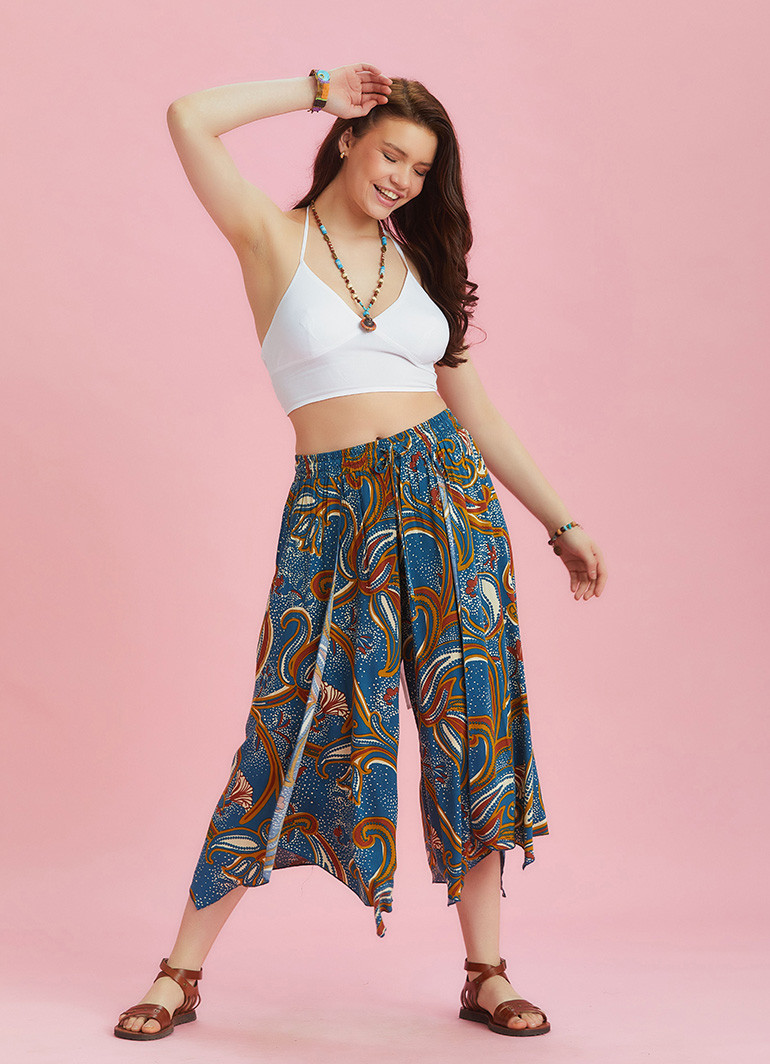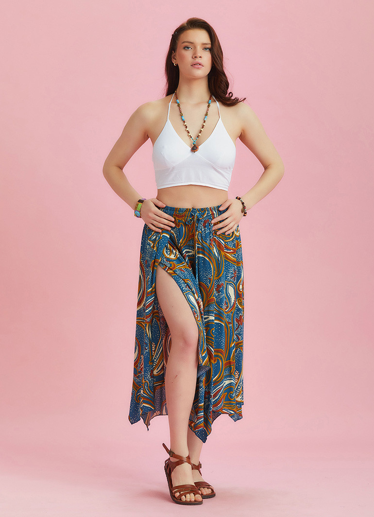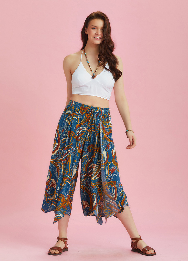 Beli Lastikli Mavi Desenli Yırtmaçlı Pantolon 6353