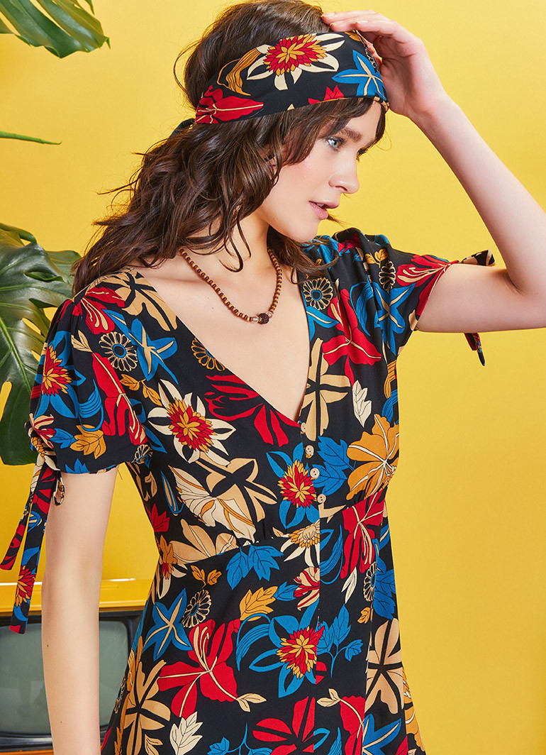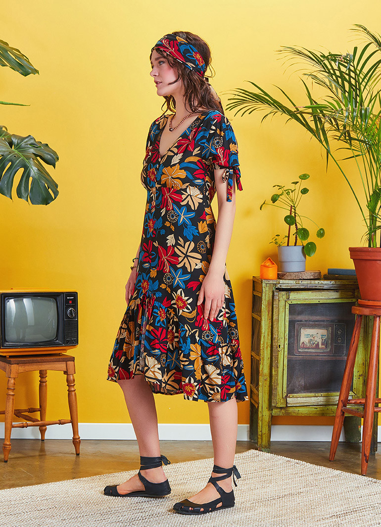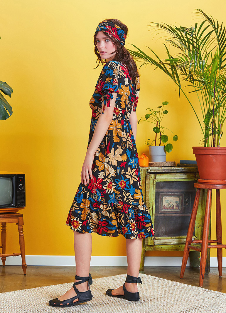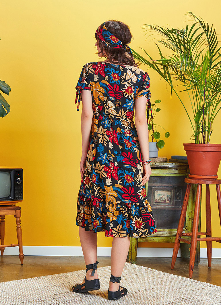 Bağcıklı Yarım Balon Kol, Düğmeli V Yaka, Arka Bel Lastikli, Volanlı, Uzun Elbise