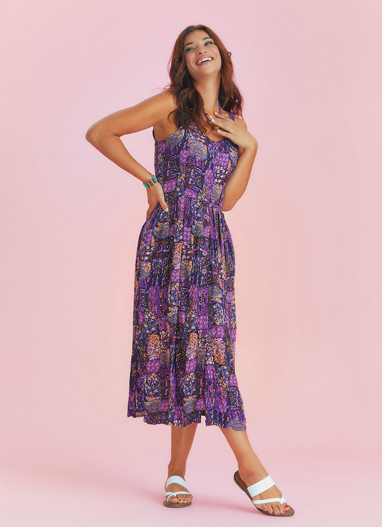 Etnik Desenli, Bohem Tarz, Geniş Askılı, Düğme Detaylı, Otantik Kadın Yazlık Uzun Elbise.