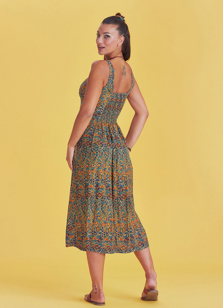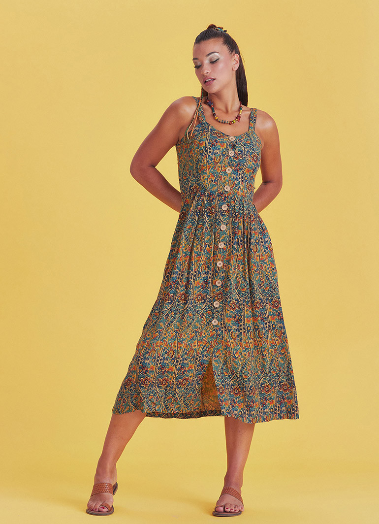 Etnik Desenli, Bohem Tarz, Geniş Askılı, Düğme Detaylı, Otantik Kadın Yazlık Uzun Elbise.