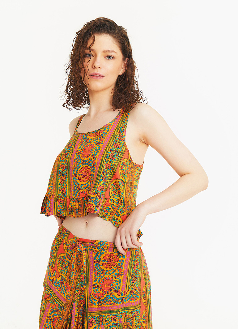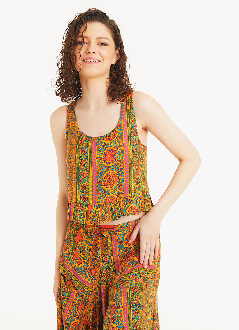 Havuz Yaka, Dökümlü, Kalın Askılı, Desenli, Yazlık Kısa Bluz