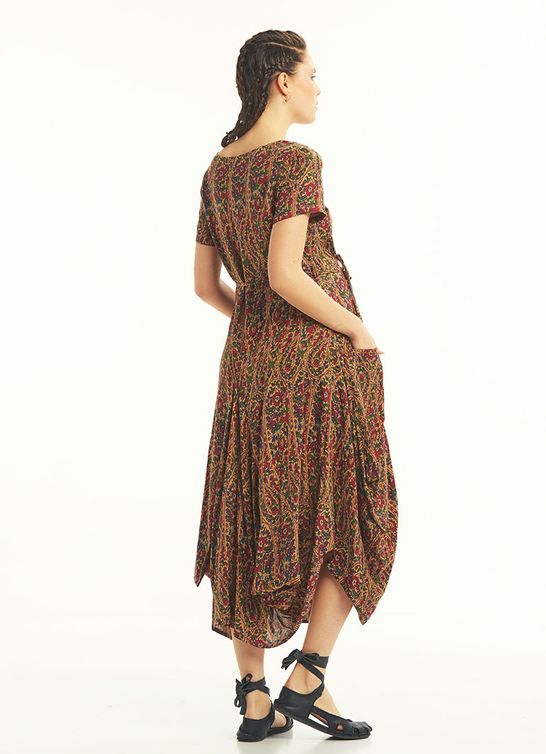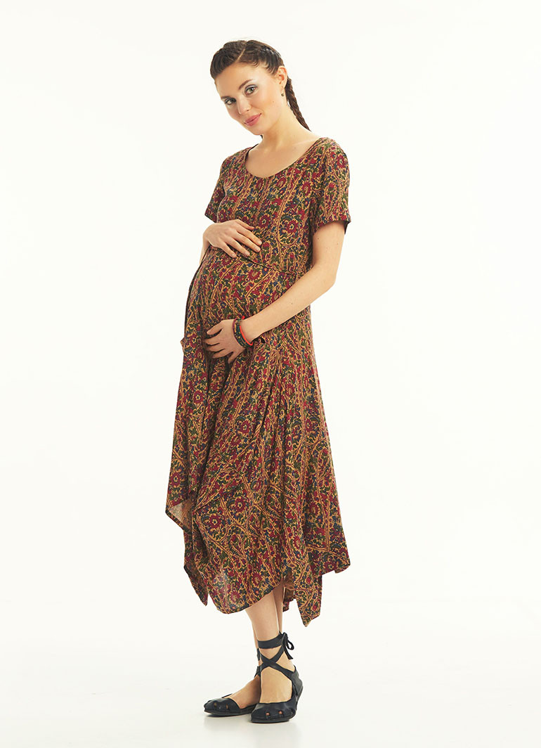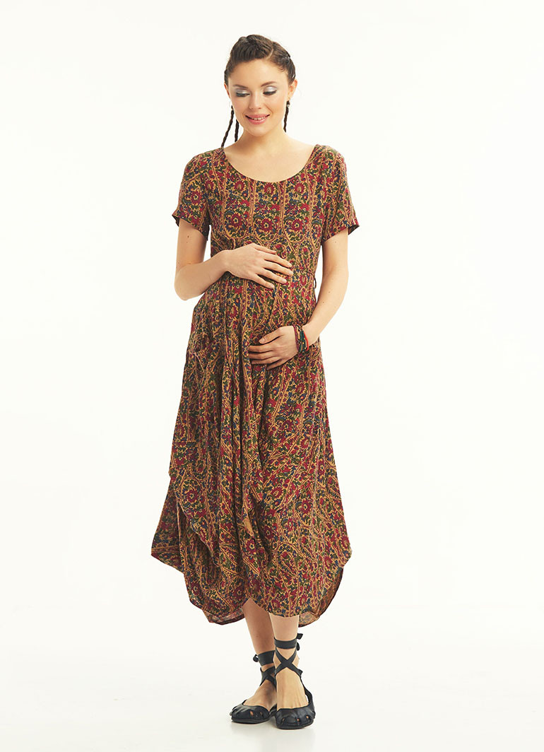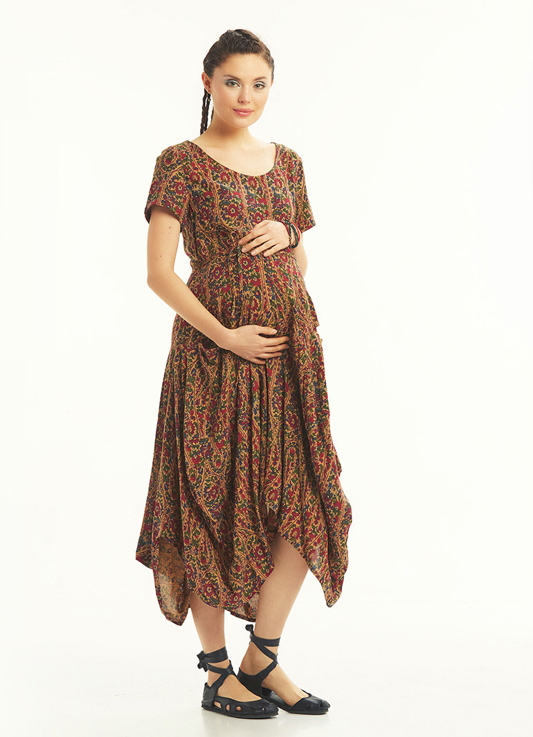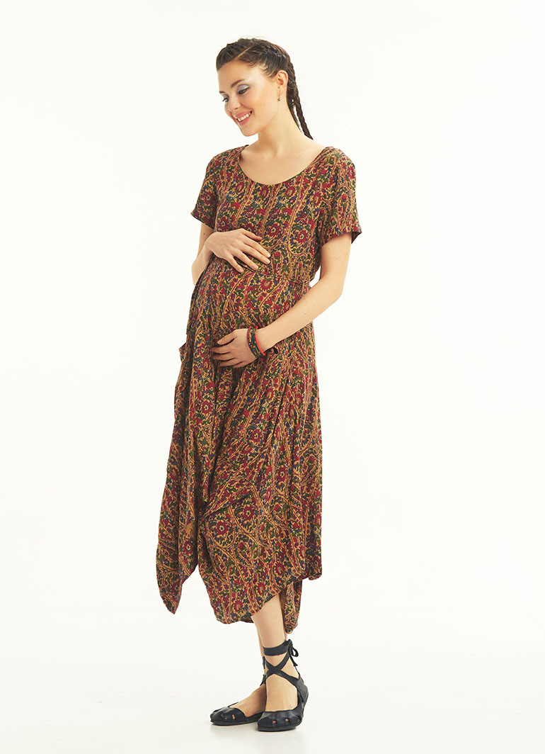 Bordo Desenli Cepli Yarım Kollu Uzun Hamile Elbise 4953
