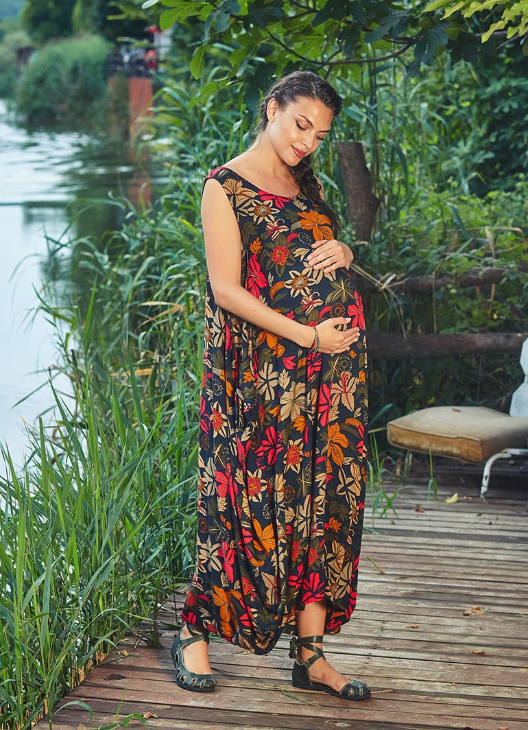 Desenli Havuz Yaka Bağcıklı Uzun Hamile Elbise 2489