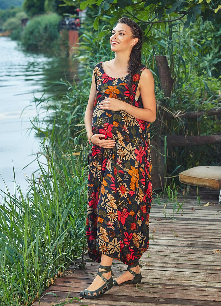 Çiçek Desen Kayık Yaka Kolsuz Siyah Hamile Elbise 1367