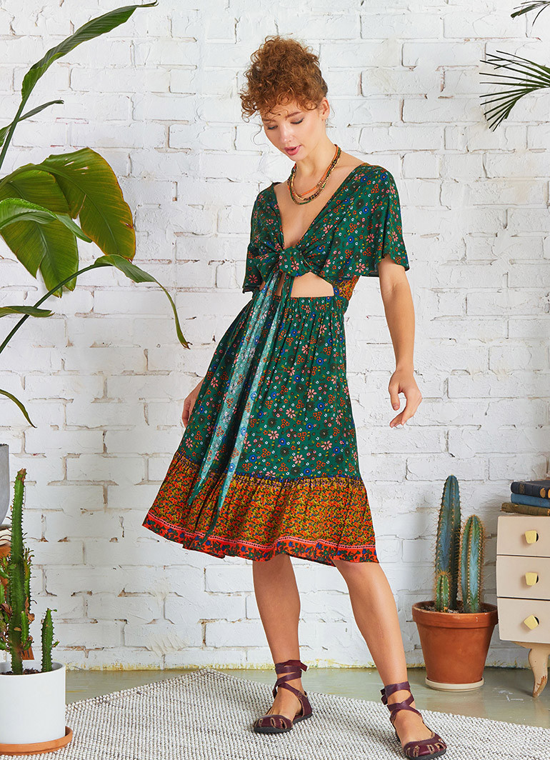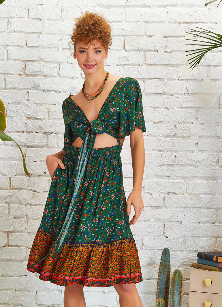 Cut Out Sırt Önden Bağlamalı Yeşil Çiçekli Elbise 5262