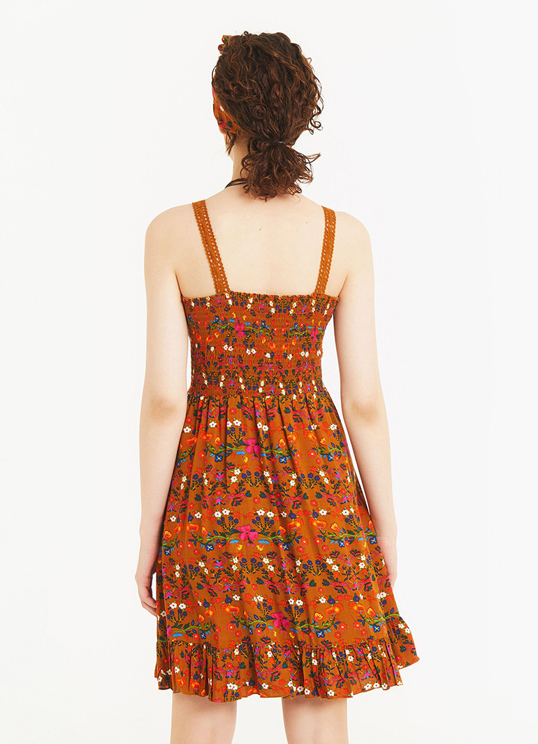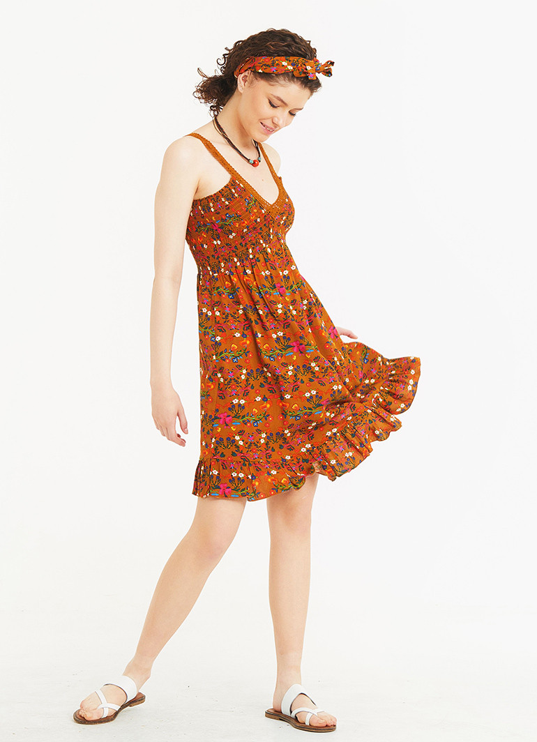 Dantel yaka detayıyla zarafeti, sarı çiçek desenleriyle enerjiyi bir araya getiren bu askılı yazlık elbise, bohem stilin tüm zarafetini yansıtıyor.