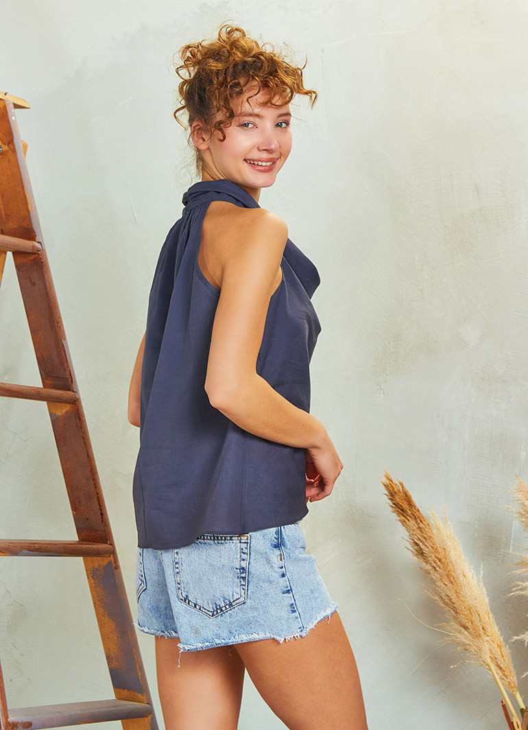 Boyundan Bağlamalı Mavi Desenli Crop Bluz 6344