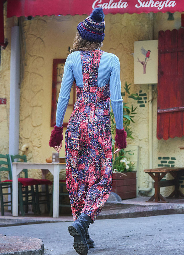 Dekolteli Fermuarlı Cepli Kadın Kırmızı Desenli Şalvar Tulum 6587
