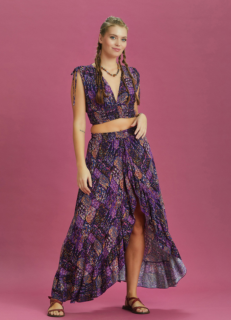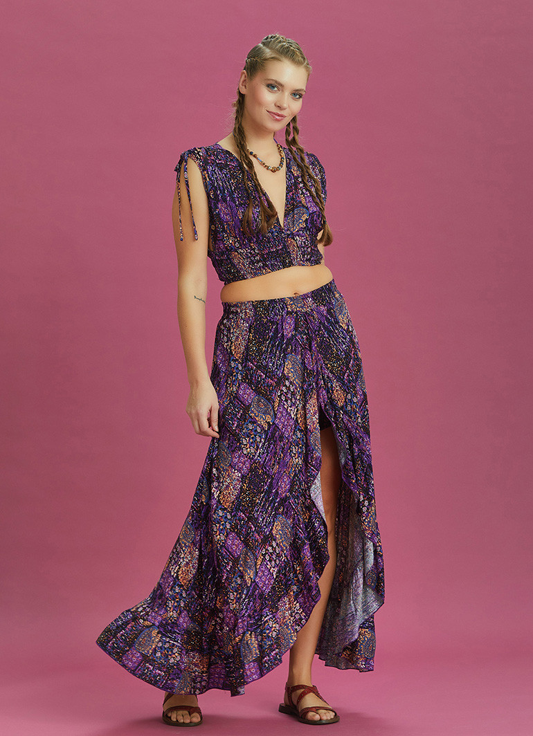 Derin Ön Yırtmaçlı Fırfırlı Desenli Şort Etek 6383