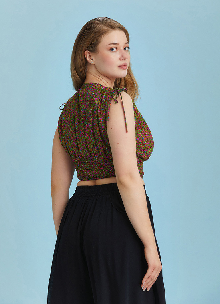 Boyundan Bağlamalı Desenli Büyük Beden Crop Bluz 6396