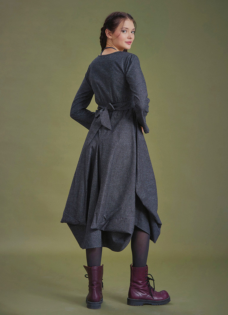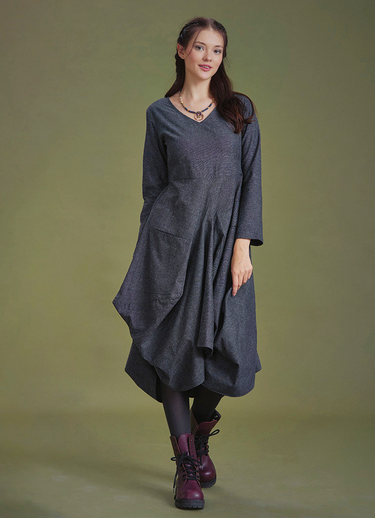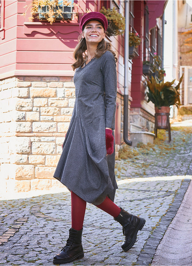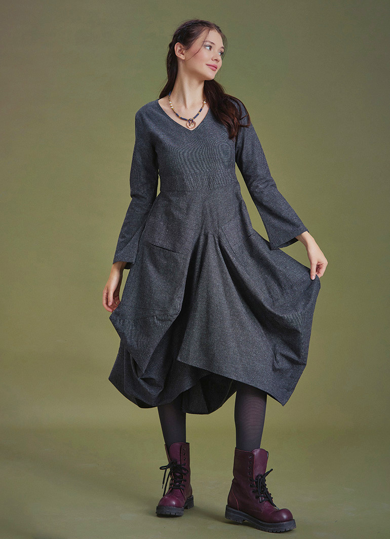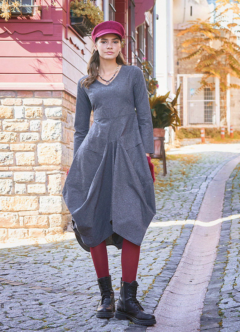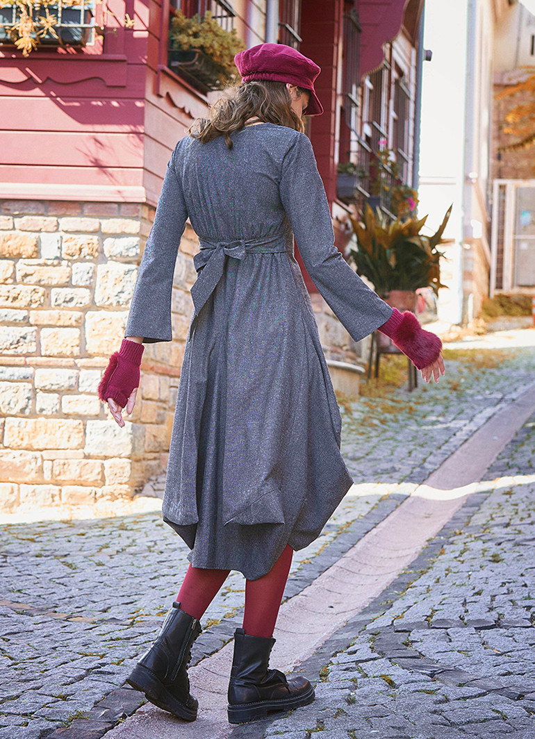 Şık, V Yaka, Balon Etek Detaylı, Gri Elbise