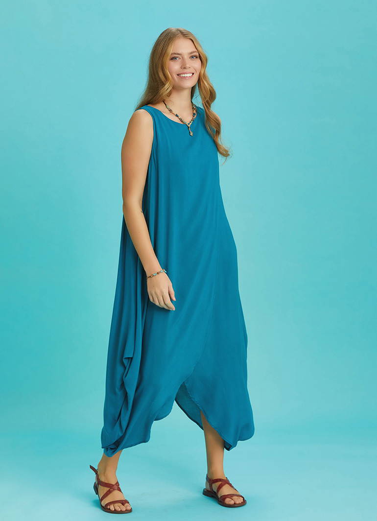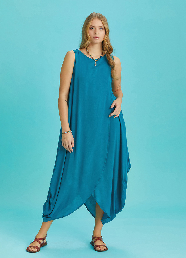 Kayık Yaka, Diyagonal Kesim Anvelop Detaylı, Kolsuz, Bol, Uzun Elbise