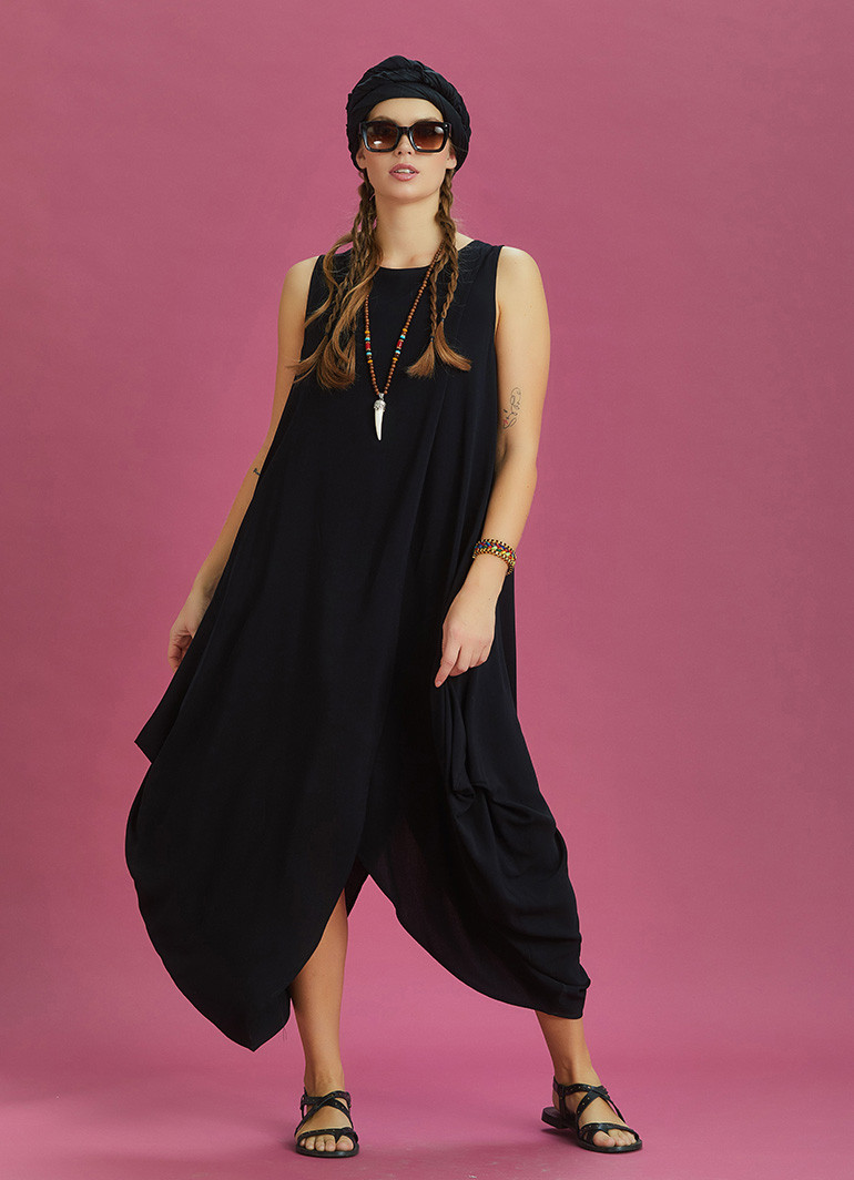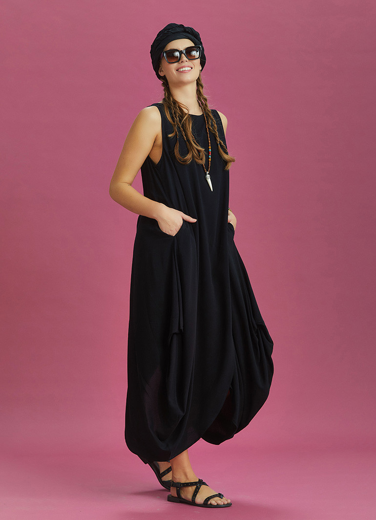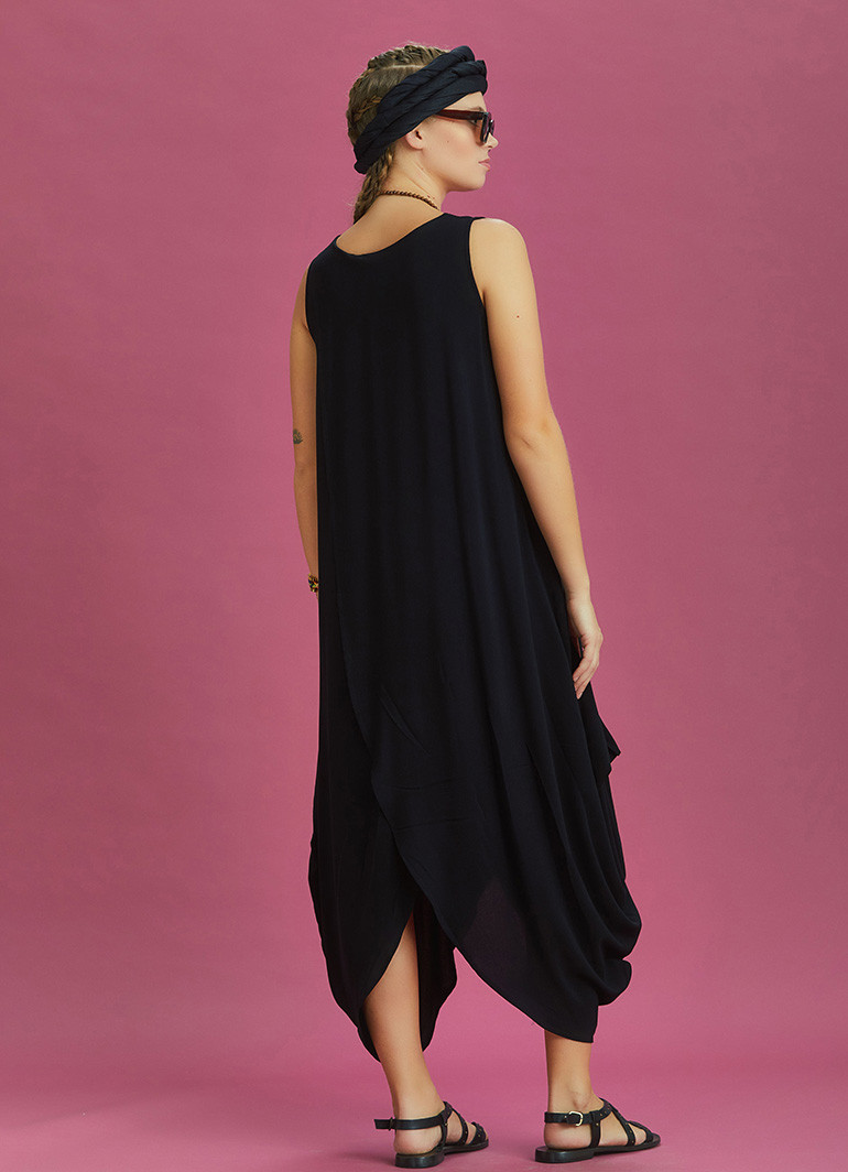 Kayık Yaka, Diyagonal Kesim Anvelop Detaylı, Kolsuz, Bol, Uzun Elbise