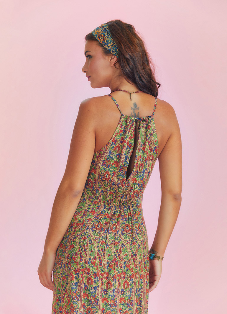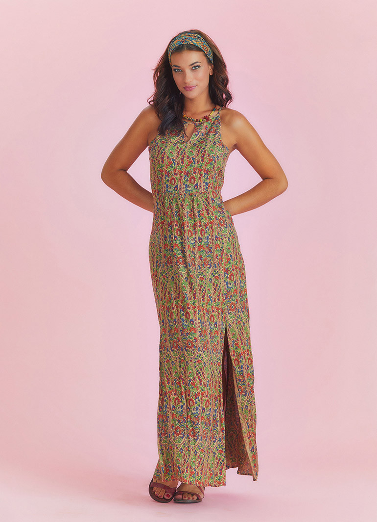 Etnik Desenli, Bohem Tarz, Çift Ön Yırtmaç, Yaka ve Sırt Dekolte Detaylı, Ayarlanabilir Bağcıklı Halter Yaka, Otantik Kadın Şık Elbise