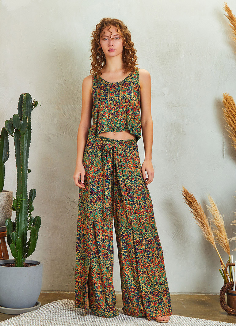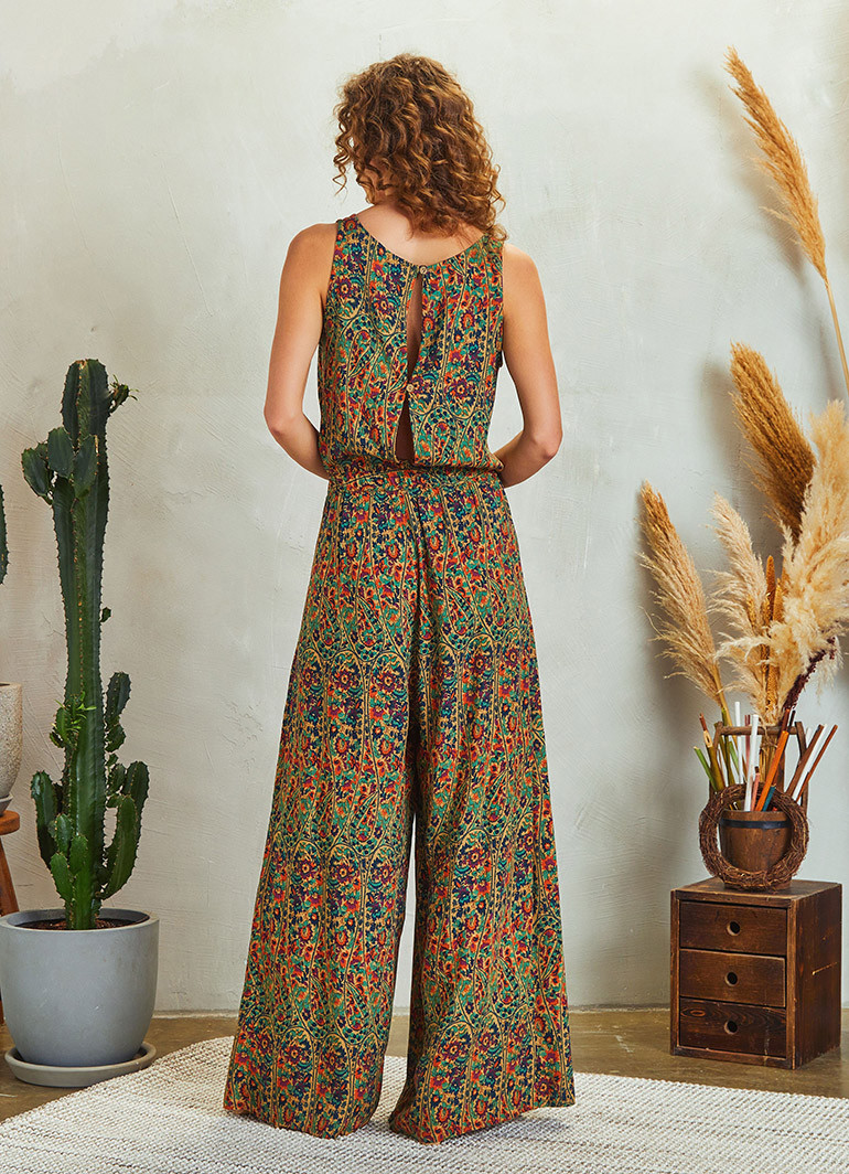 Etnik Desenli, Bohem Tarz, Kayık Yaka, Düğmeli Sırt Dekoltesi, Beli Lastikli, Kuşak ve Kapak Detaylı, Bol Paça, Otantik Kadın Tulum Elbise