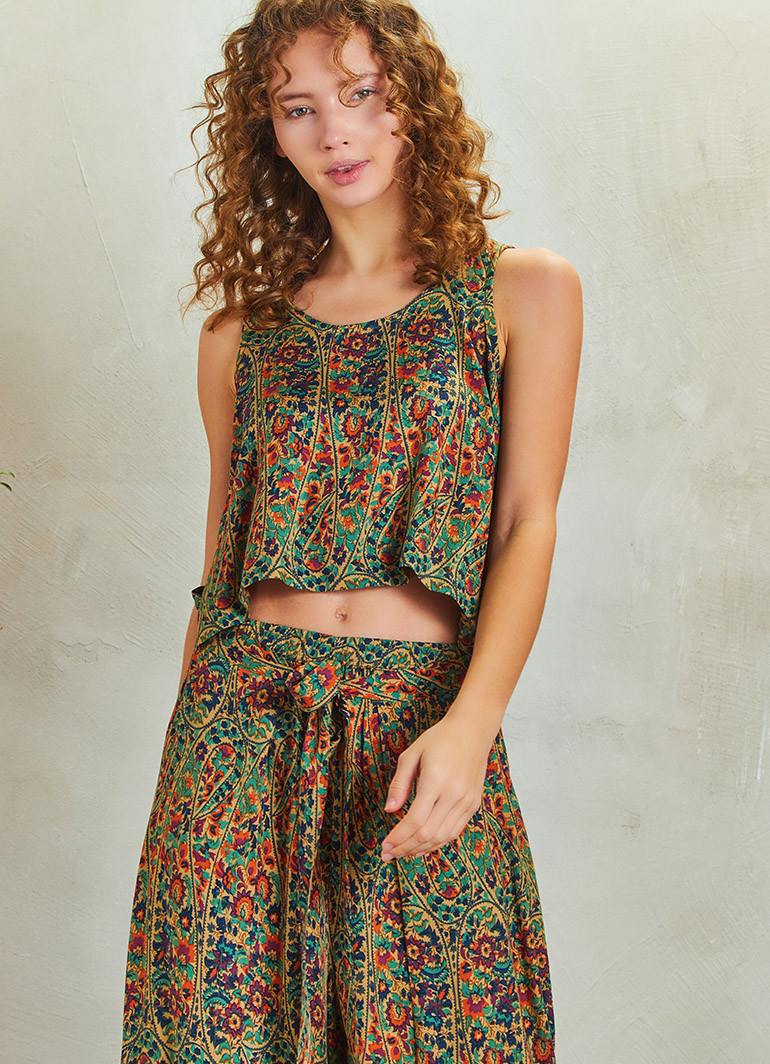 %100 dokuma viskon. Kayın ağacından elde edilmiş doğal selülozdan dokunmuş kumaştandır. Çok hafif ve dökümlüdür. Polyester içermez, sizi terletmez. Çamaşır makinasında 30 derecede yıkayabilirsiniz.