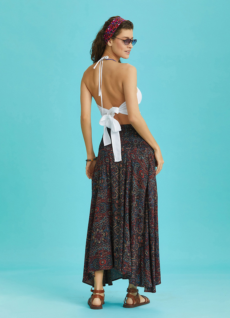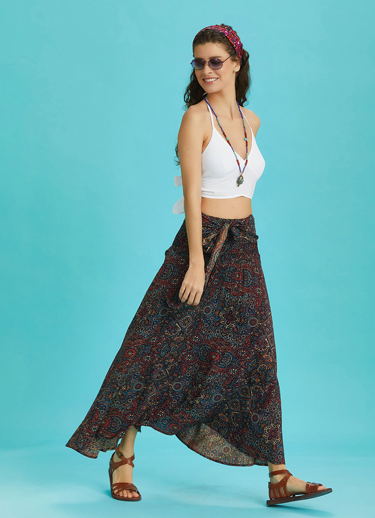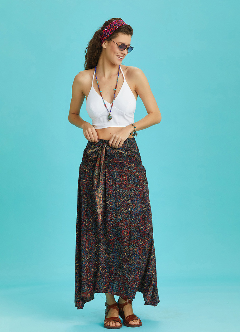Geniş Gipe Bel Detay, Kuşaklı, Asimetrik Kesim, Desenli, Salaş, Uzun Etek