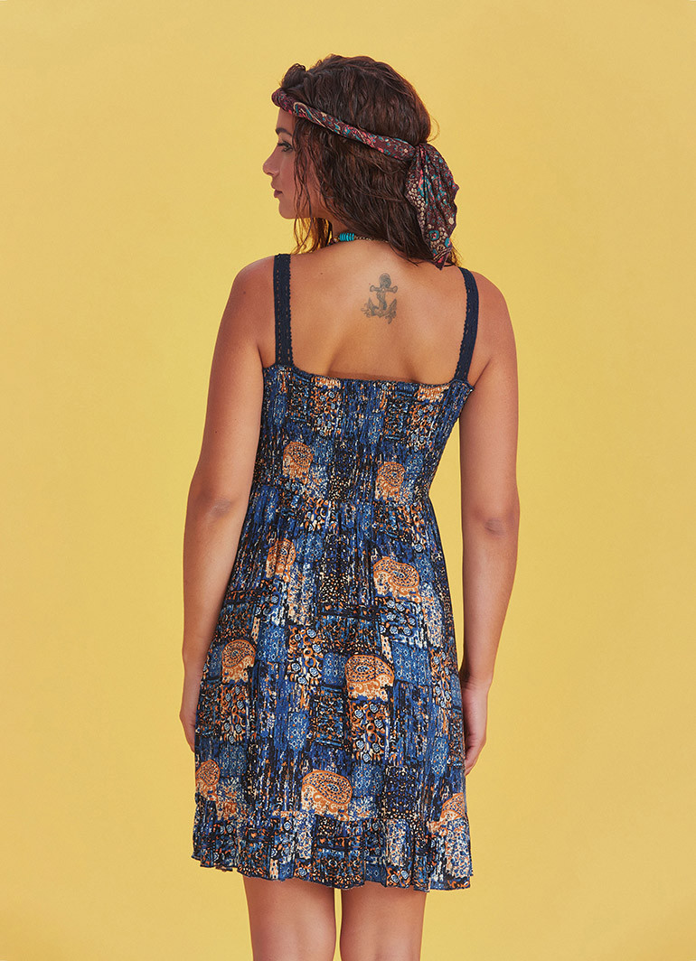 İndigo Desenli Dantel Yaka Askılı Yazlık Elbise 4904