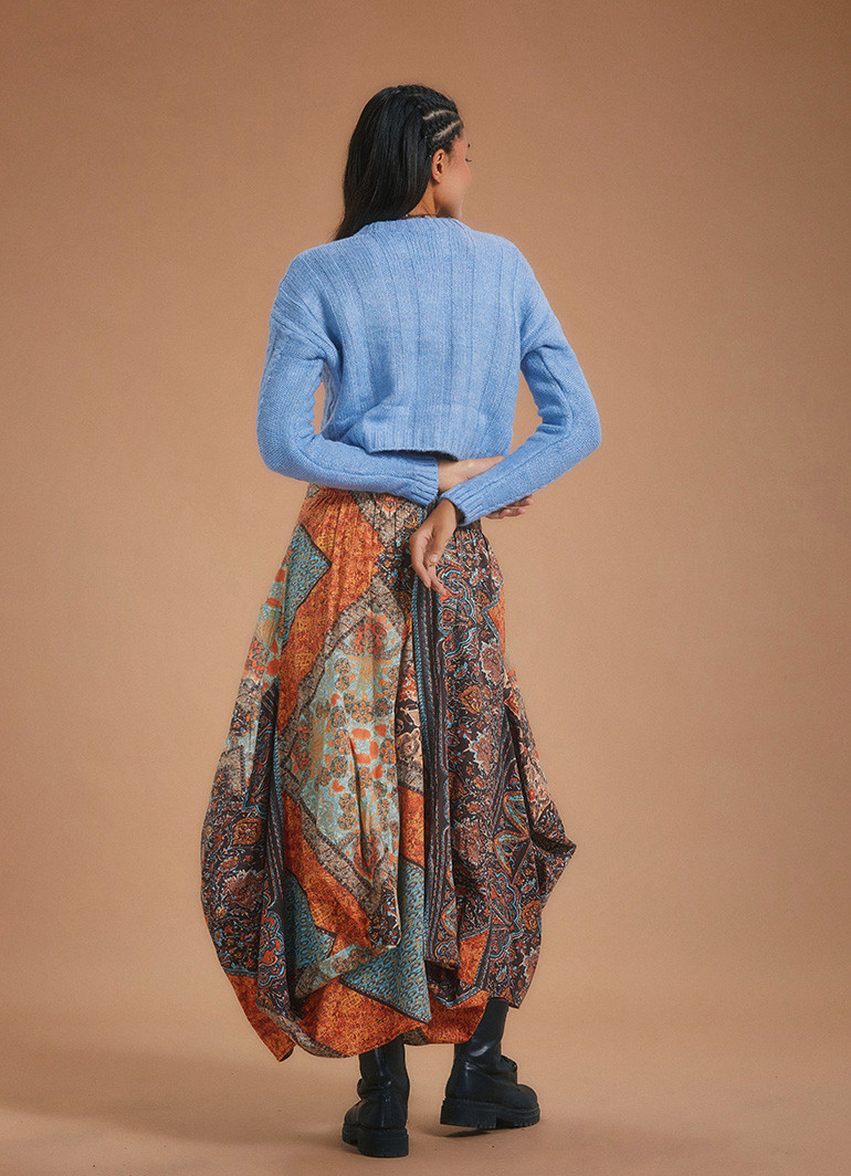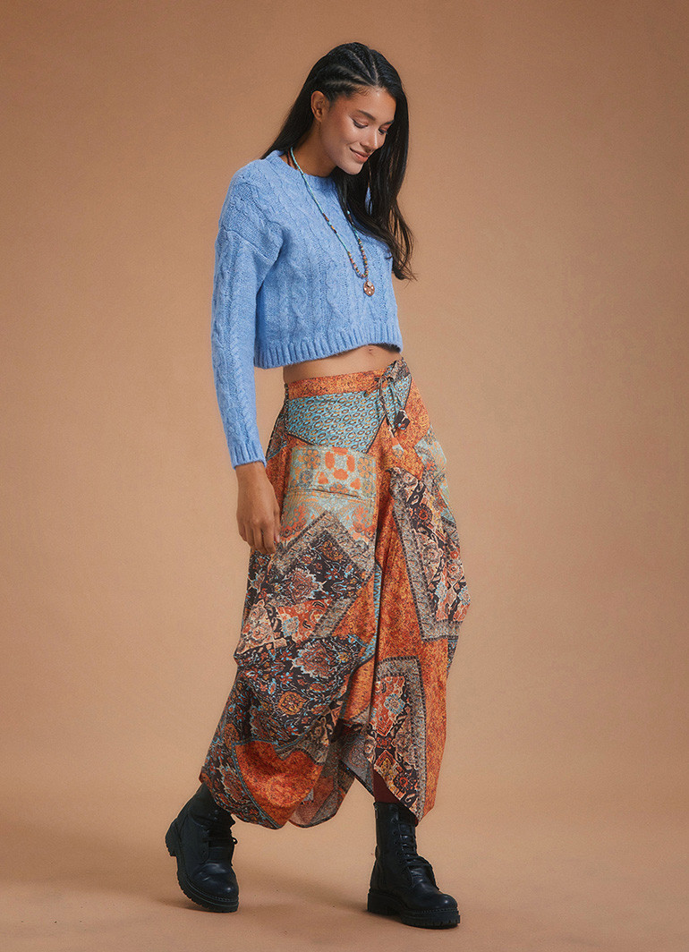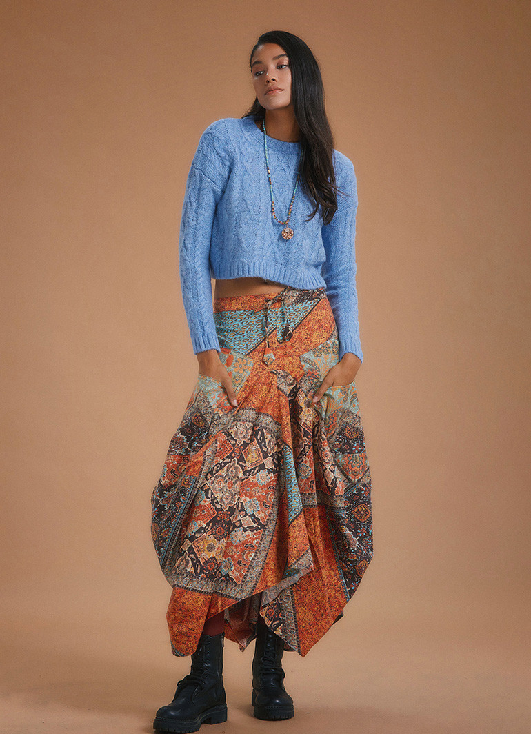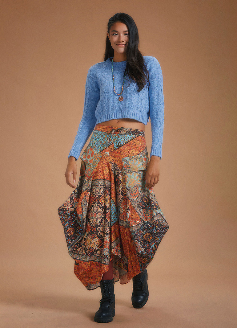 Günlük stilinize şıklık ve konforu bir arada katacak bu kahve desenli uzun etek, hem estetik hem de fonksiyonel detaylarıyla öne çıkıyor. Asimetrik kesimi ve siyah etnik desenleriyle fark yaratan bu parça, özgün stilinize modern bir dokunuş kazandırır.