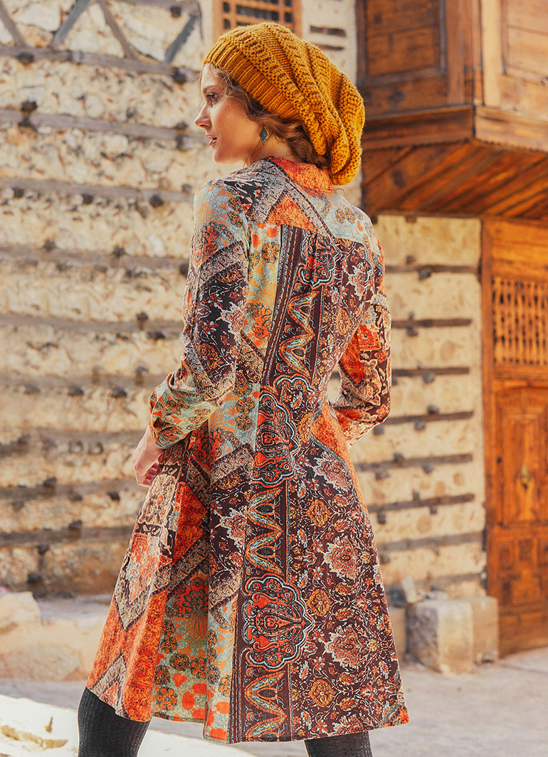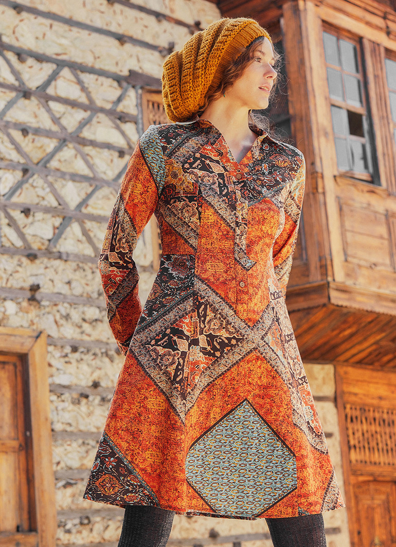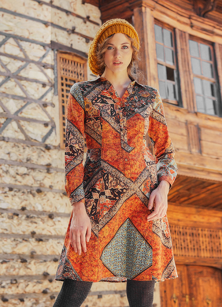 Gömlek Yaka, Düğme Detaylı, Etnik Desenli, Kloş Elbise