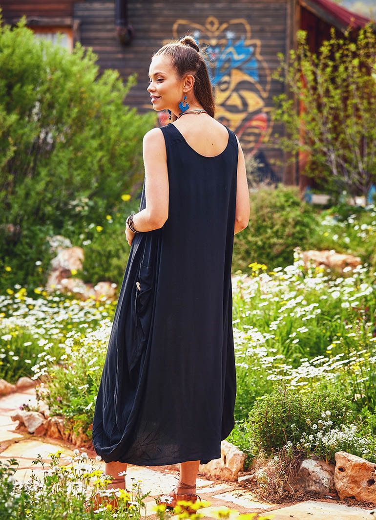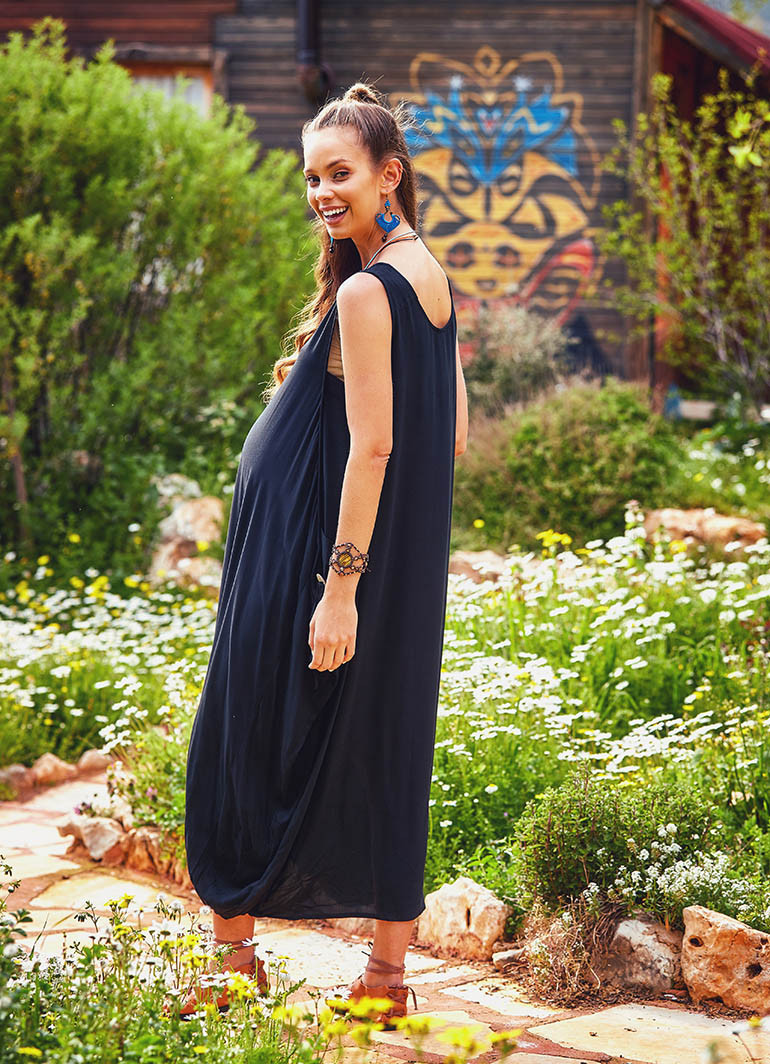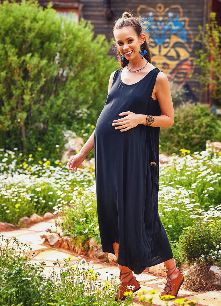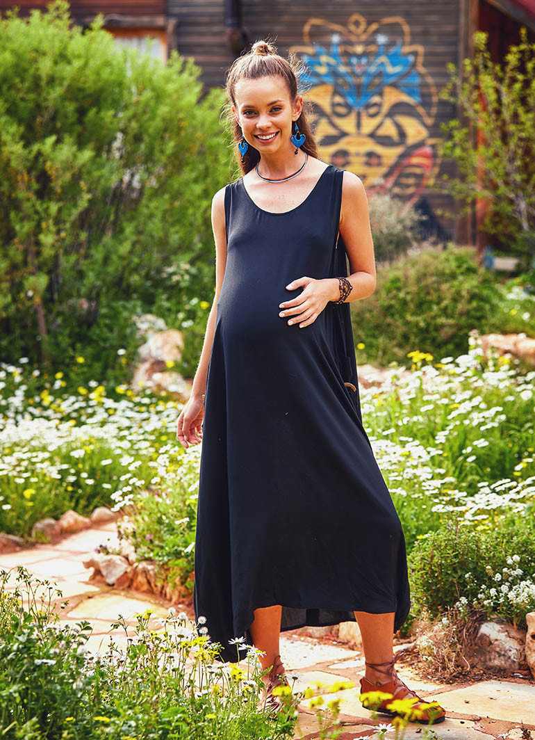 Düğme Detaylı, Kayık Yaka, Uzun, Siyah Hamile Elbise