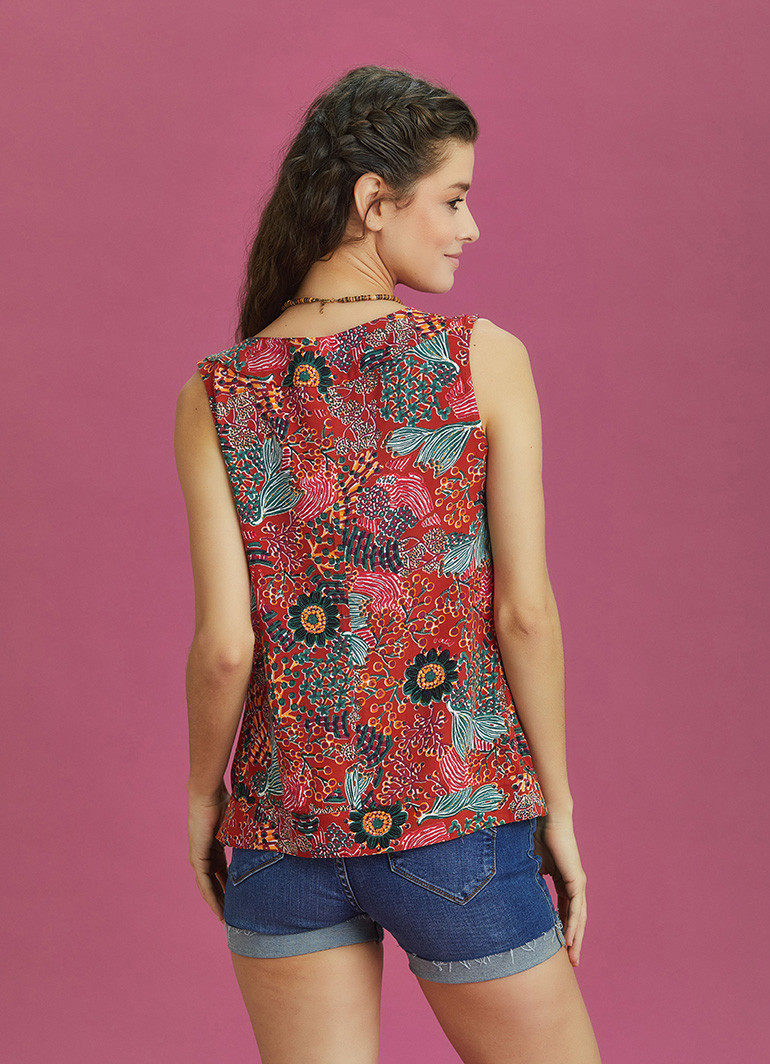 Kırmızı Çiçekli Kolsuz Düğmeli Kadın Bluz 6469