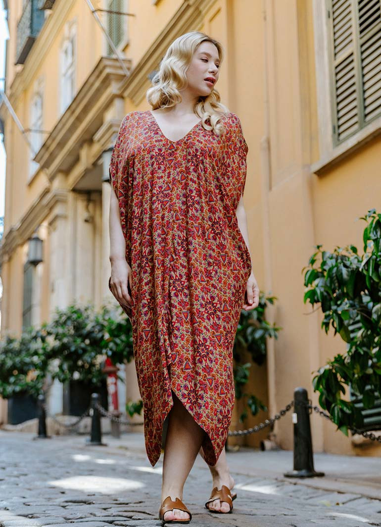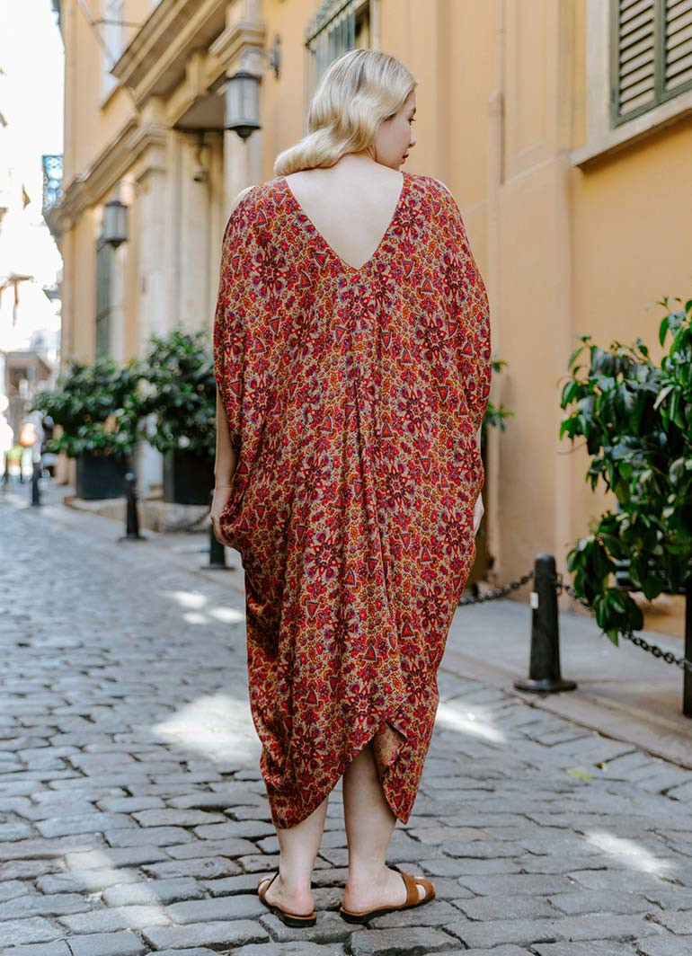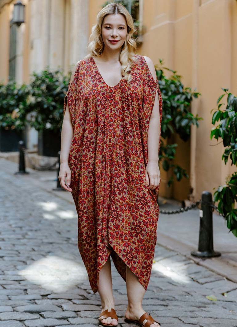 Etnik Desenli, Bohem Tarz, Kayık Yaka, Omzu Açık, Sırt Dekolteli, Otantik Kadın Yazlık Elbise.