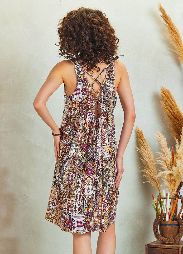 Kuş Gözü Bağcıklı Açık Sırt Detay, Kolsuz, Rahat Kesim, Midi Boy, Yazlık Elbise