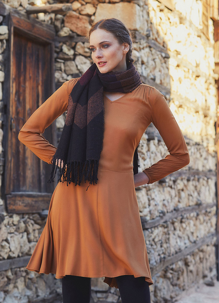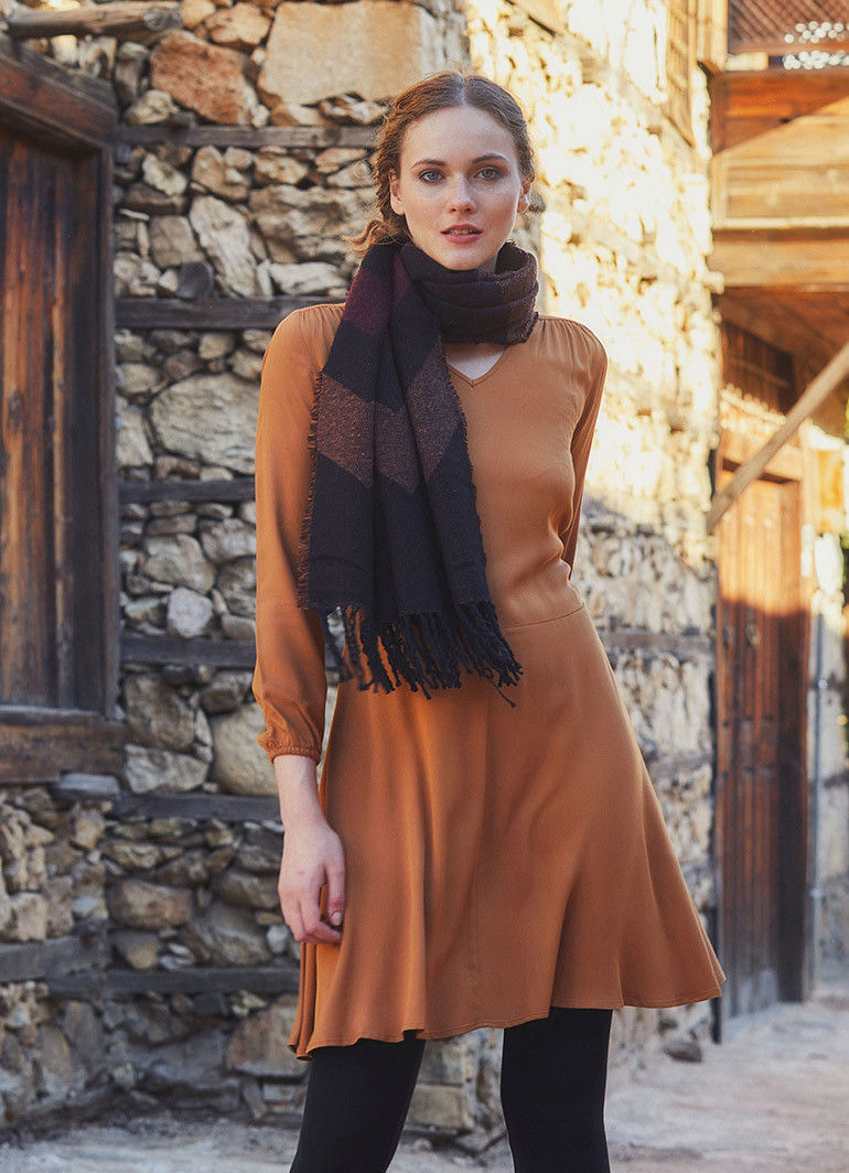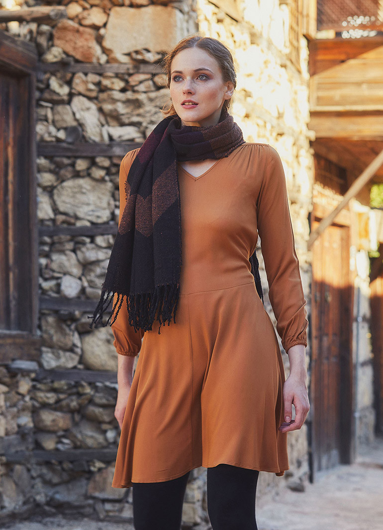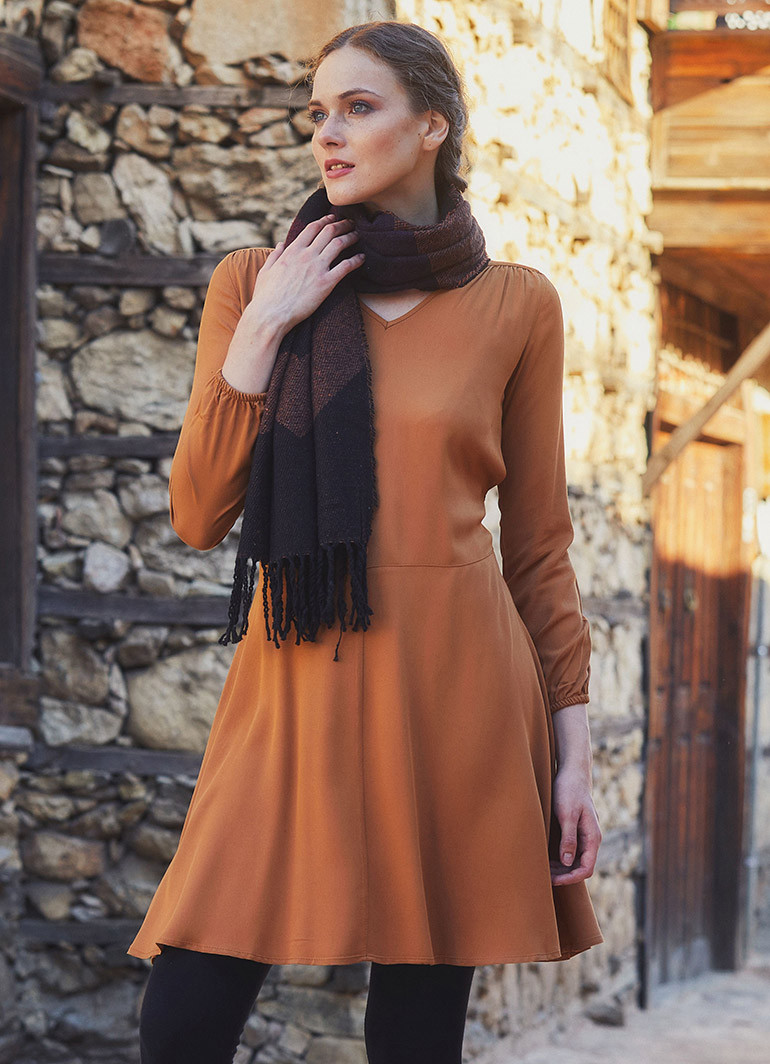 V Yaka, Uzun Kollu, Kuşak Detaylı, Kloş, Bohem Tarz, Kışlık Elbise