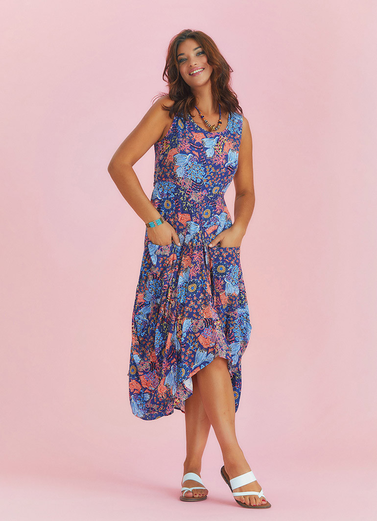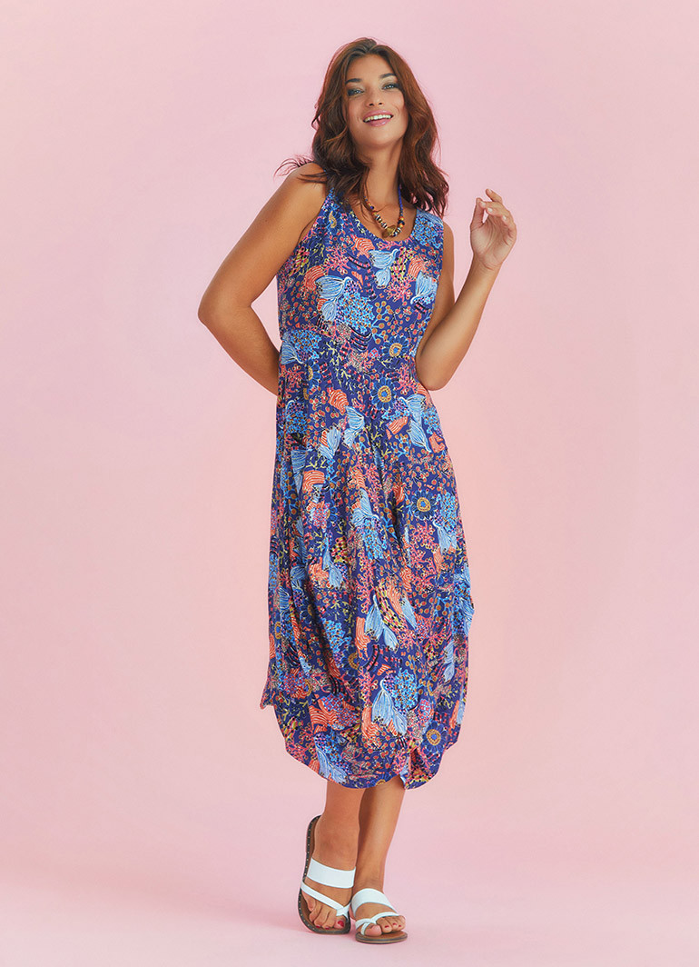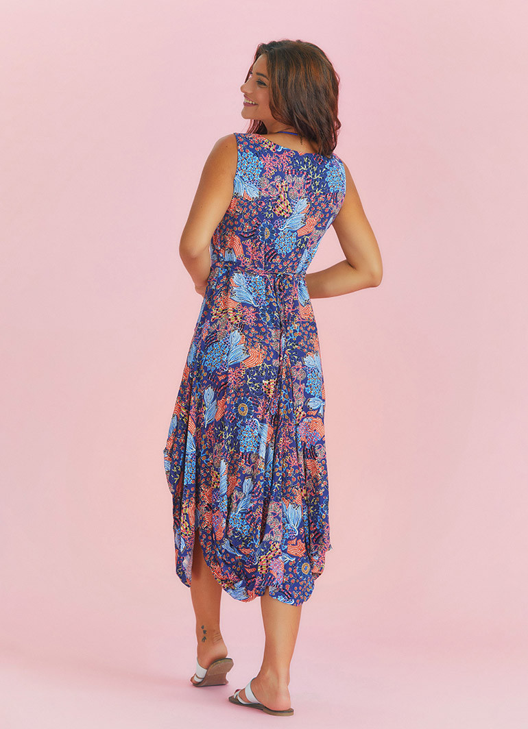 Mavi Desenli Kayık Yaka Asimetrik Kesim Elbise 6553