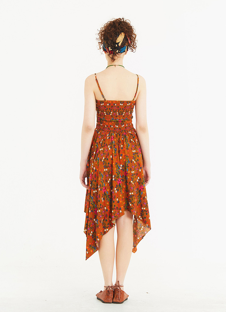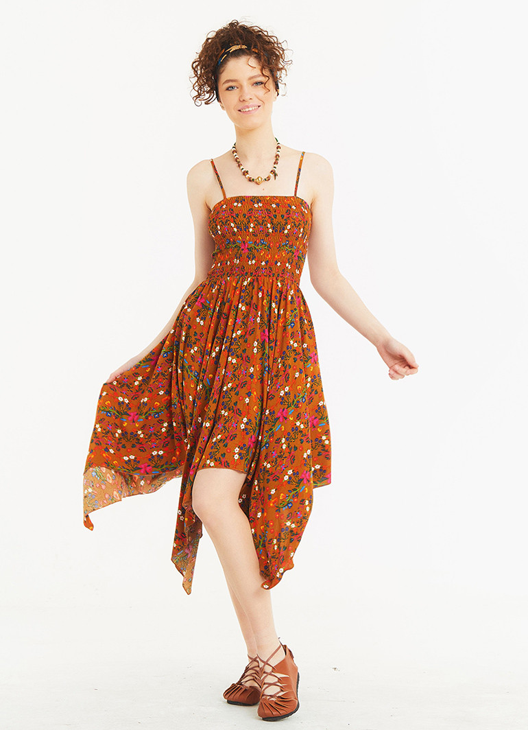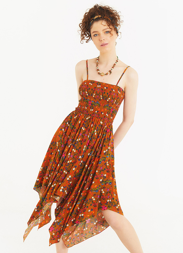 Mendil Etek İnce Askılı Salaş Hardal Çiçekli Elbise 5333
