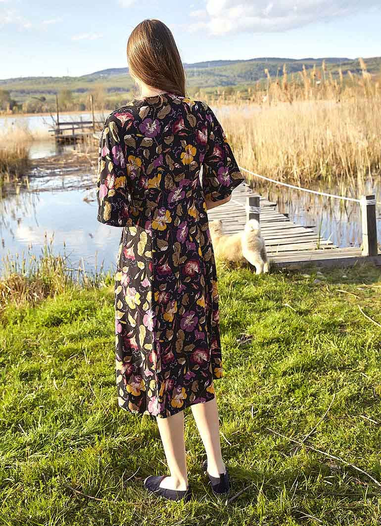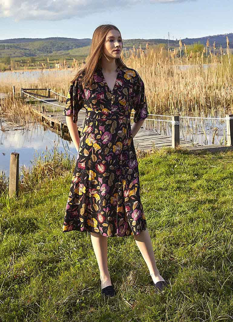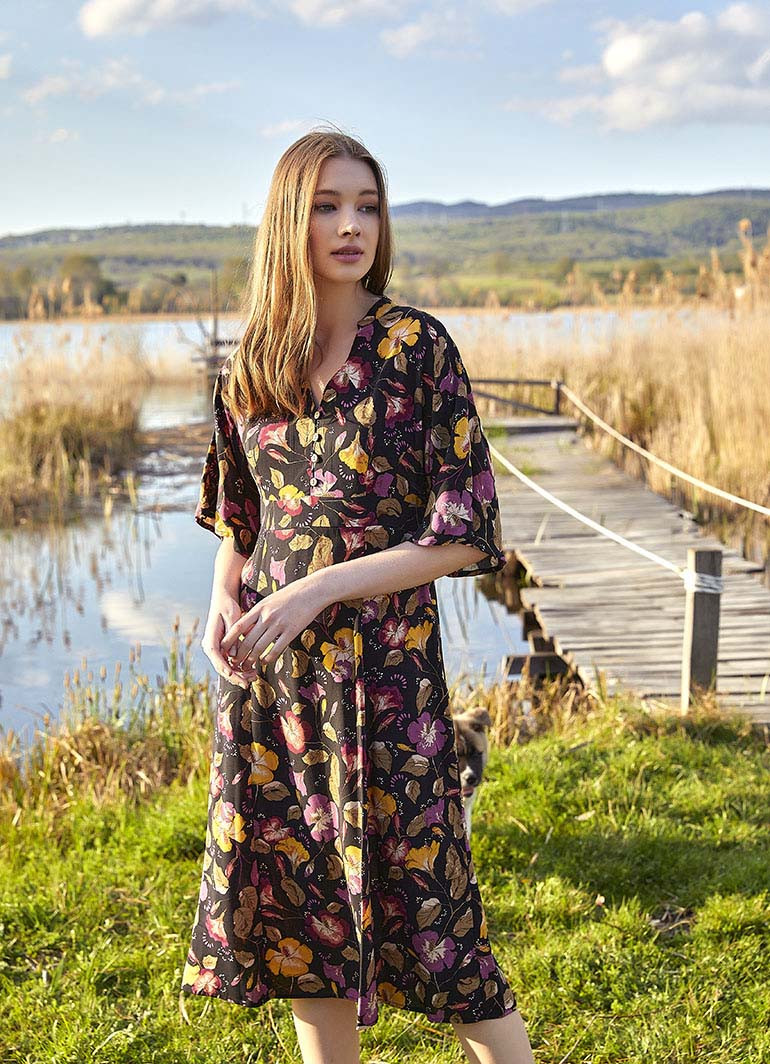 Dik V Yaka, Ön Düğme Detaylı, Gizli Yan Fermuar Kapatmalı, Yarım Kol Elbise