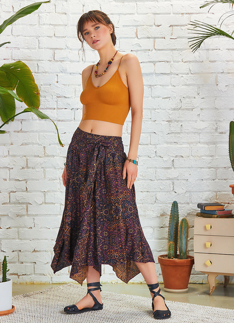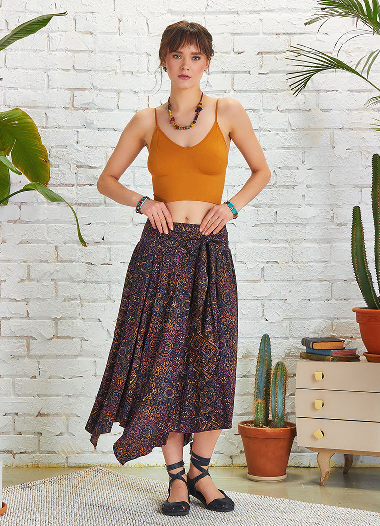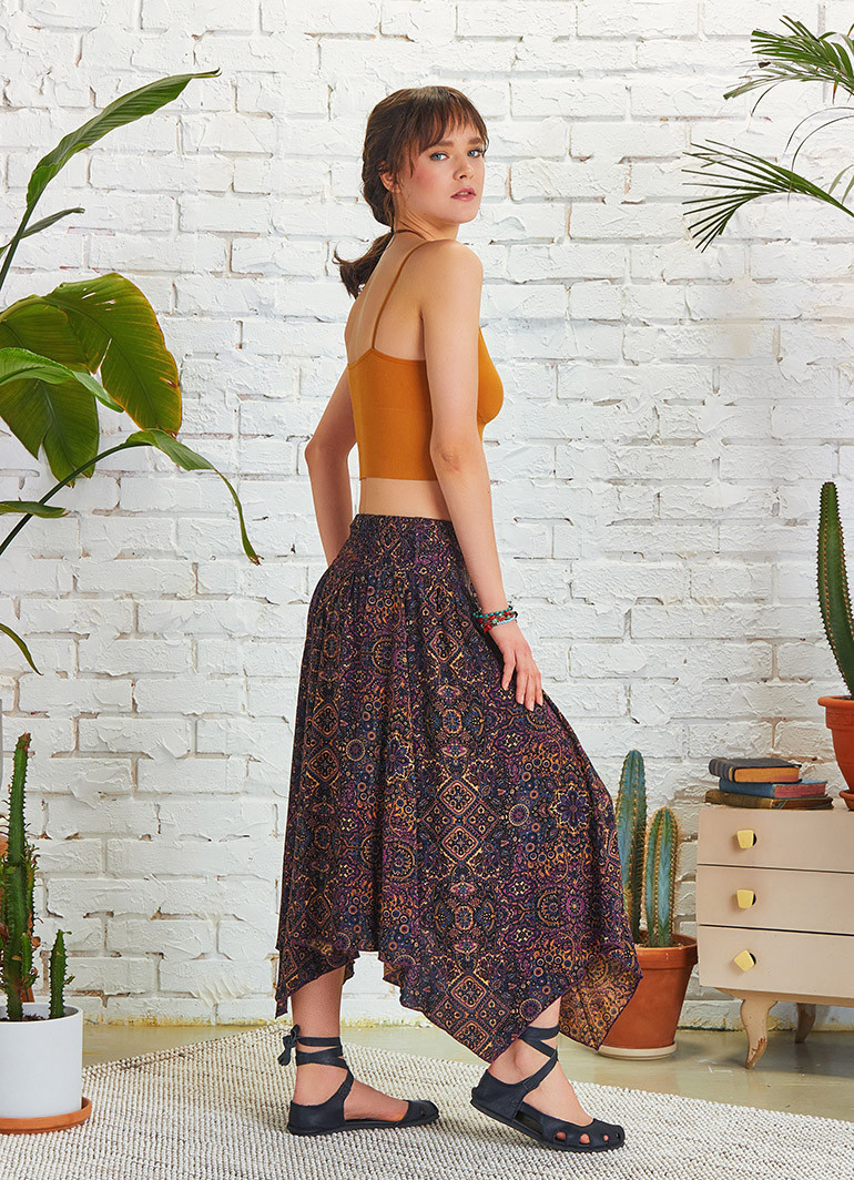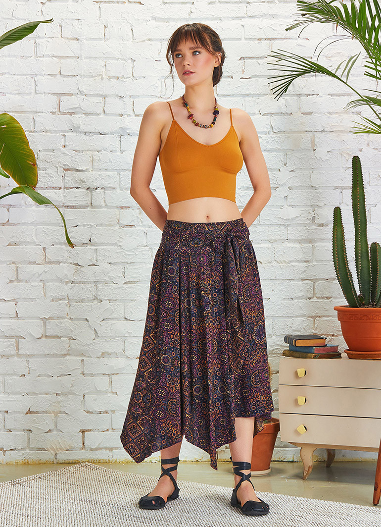 Mor Desenli Beli Bağlamalı Salaş Midi Kloş Etek 5133 ile stilinize özgün bir dokunuş katın. Hafif ve doğal viskon kumaşı sayesinde yaz günlerinde serinlik sunarken, zarif etnik desenleriyle fark yaratır.