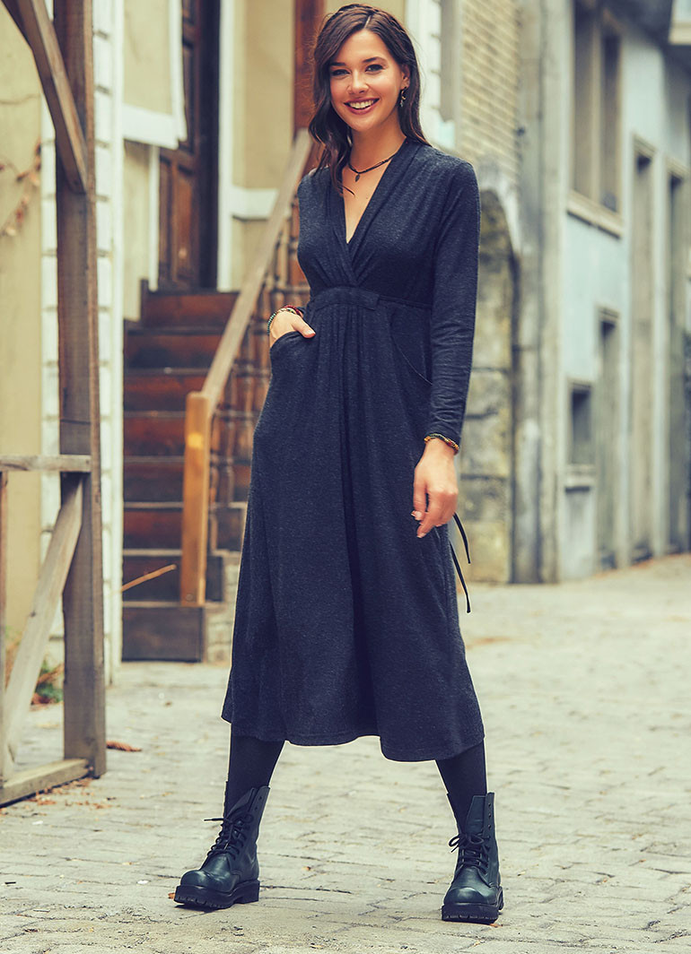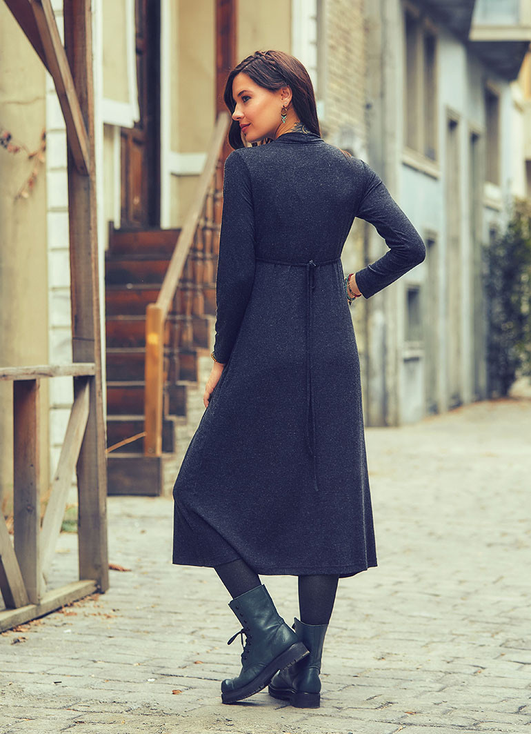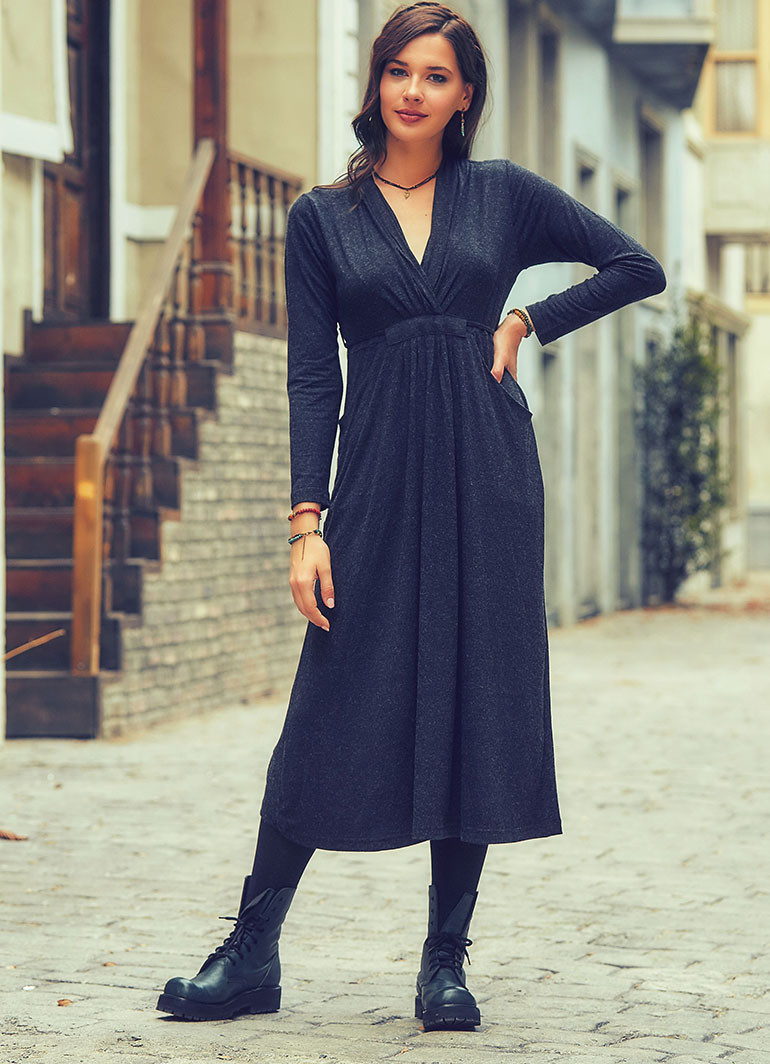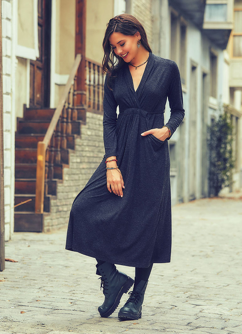 Bağcıklı, Uzun Kol, V Yaka, Kışlık Antresit Elbise
