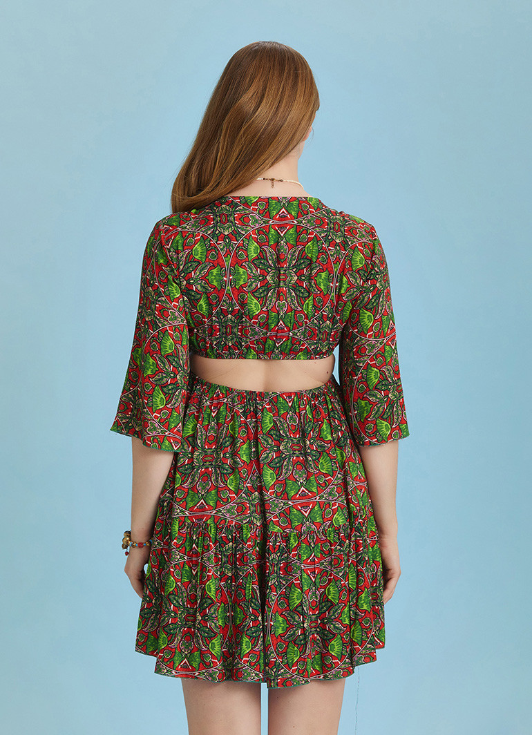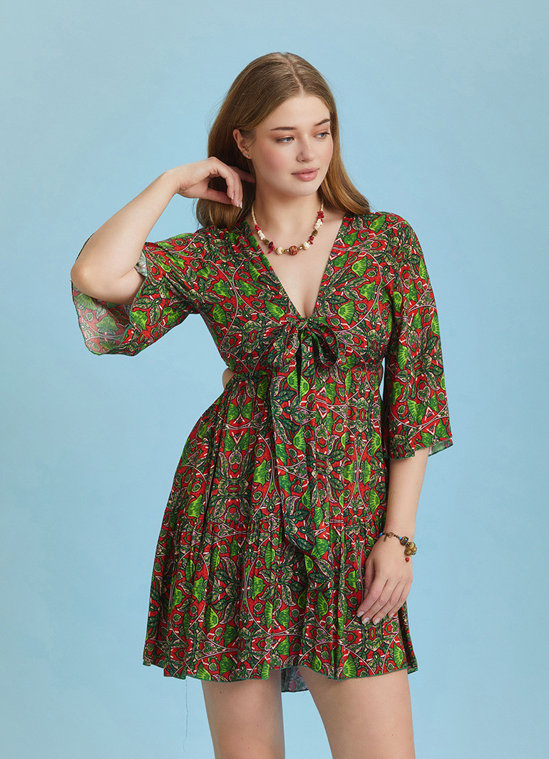 Önden Bağlamalı V Yaka, Yarım Kelebek Kol, Sırtı Açık, Kısa Kloş Elbise