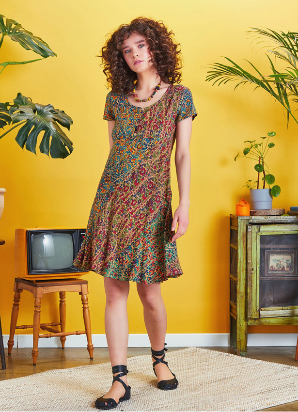 Havuz Yaka, Kısa Kollu, Ön Düğme Detaylı, Patchwork, Kısa Yazlık Elbise
