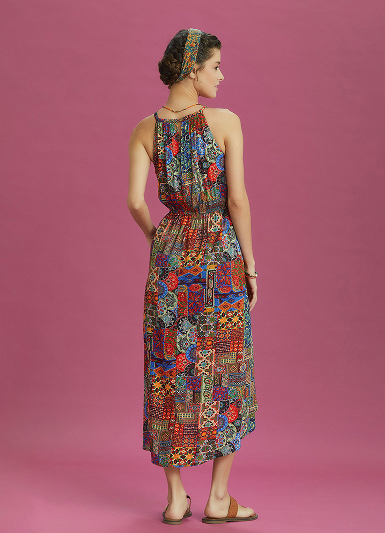 Etnik Desenli, Bohem Tarz, Halter Yaka Detay, Anvelop, Otantik Kadın Önü Kısa Arkası Uzun Elbise.