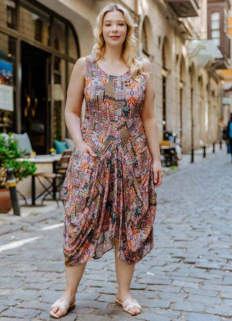 Etnik Desenli, Bağcıklı, U Yaka, Büyük Beden Elbise