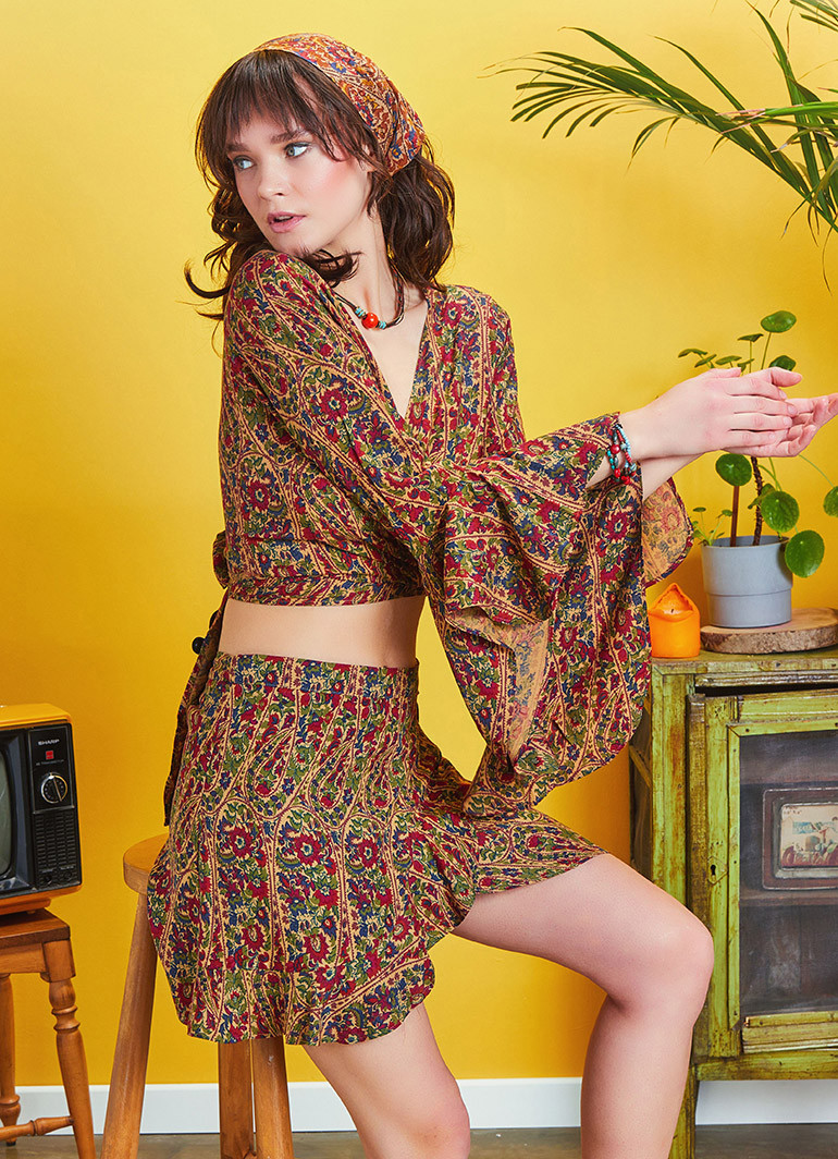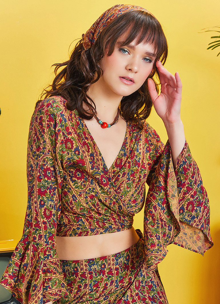 Volanlı Kol Ucu Detaylı, Bağlamalı, Kruvaze Yaka, Uzun Kollu Crop Bluz