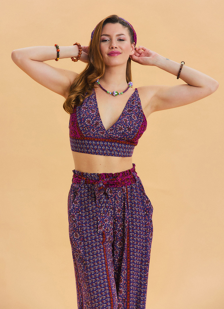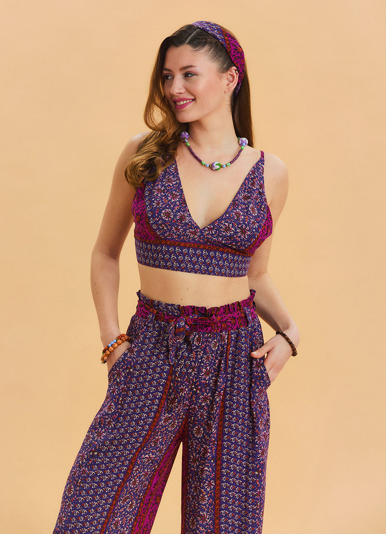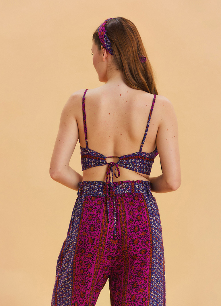 Yaz gardırobunuzun vazgeçilmezi olacak Bağcıklı Sırtı Açık Ayarlanabilir Mor Çiçekli Bluz 6966, eşsiz mor çiçek desenleri ve ayarlanabilir bağcıklarıyla stilinize zarif bir dokunuş katıyor.