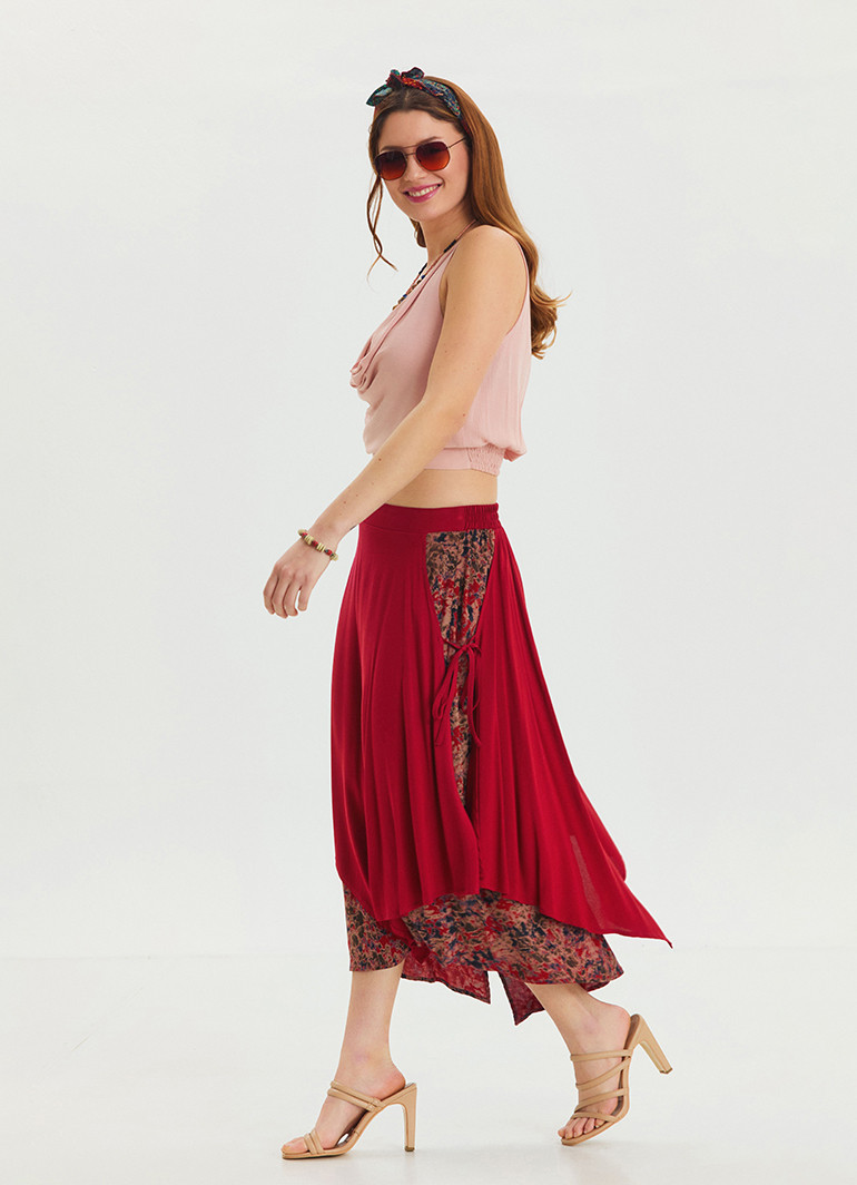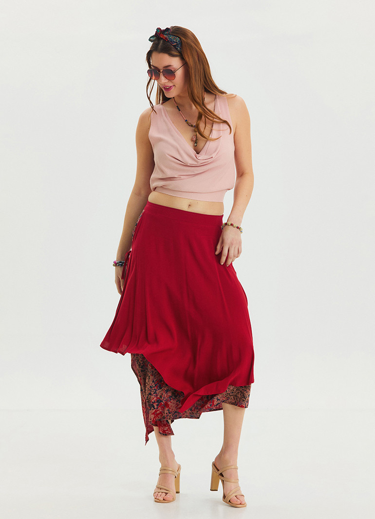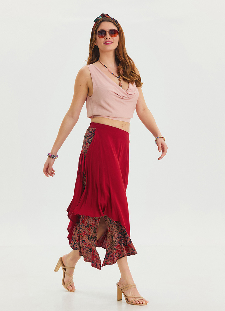 Canlı kırmızı rengi ve modern asimetrik kesimi ile yaz aylarının vazgeçilmezi olan bu etek, stilinize zarif bir dokunuş katıyor.