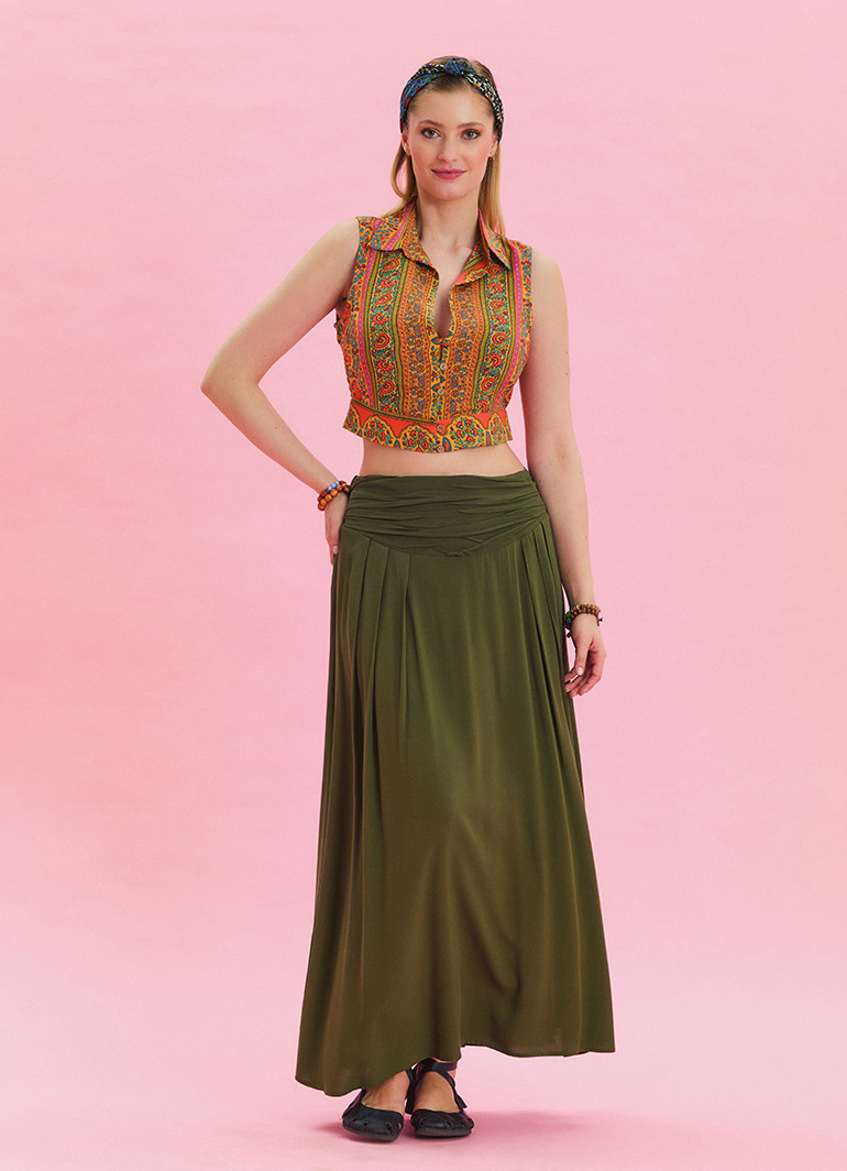 Beli Lastikli Drape Detaylı Haki Bohem Etek 6813