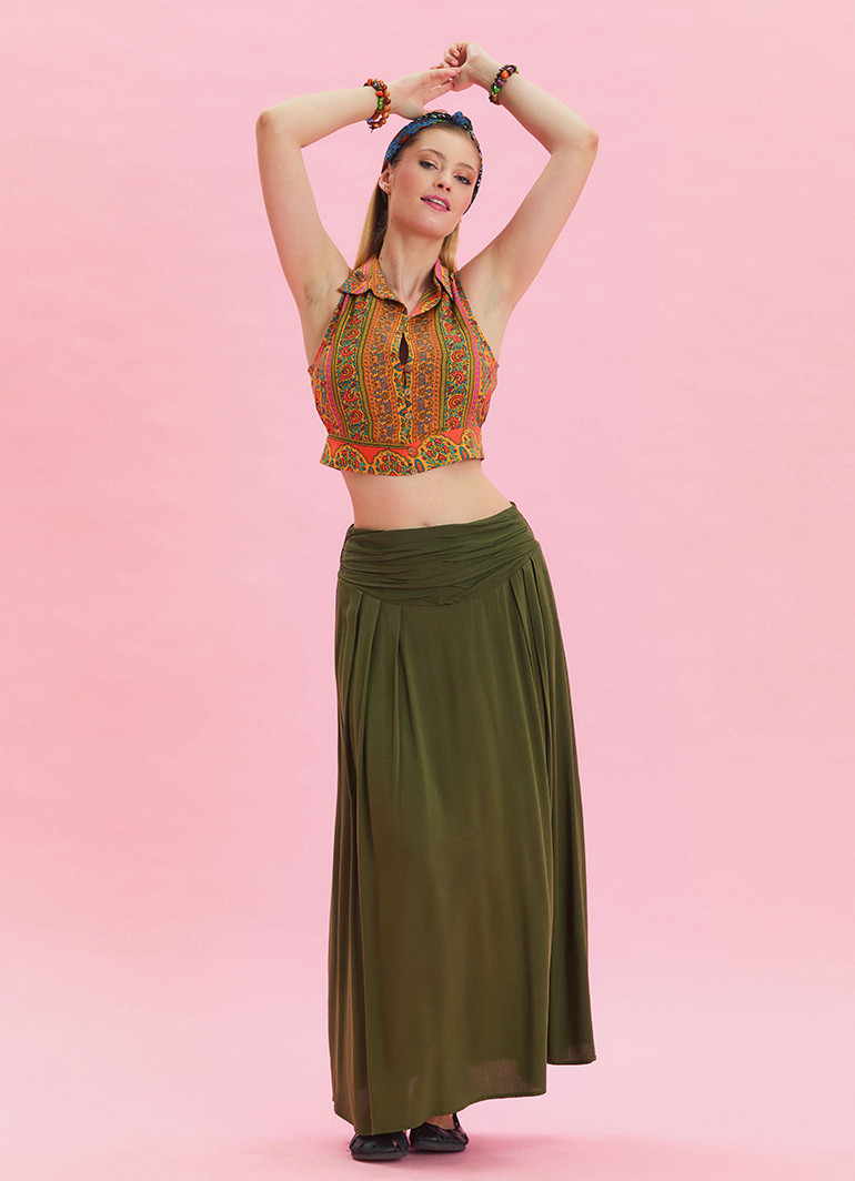 Özenle oluşturulan drape detayları ve beli lastikli yapısı, etek üzerinde zarif bir siluet yaratırken, haki tonları modern stilinize bohem bir dokunuş katar.