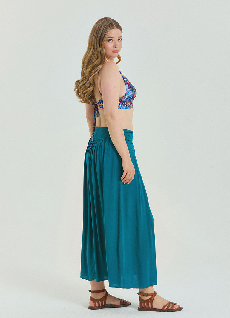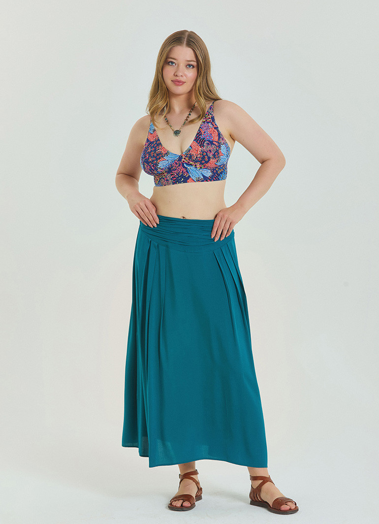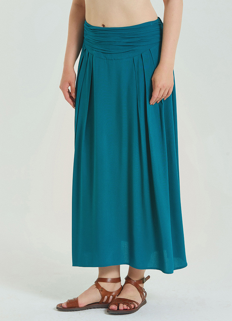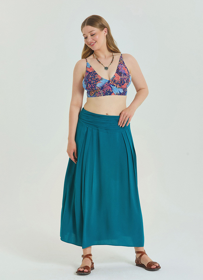%100 dokuma viskon kumaşı, polyester içermediği için terletmez ve sıcak havalarda dahi ferah kalmanızı sağlar. Kayın ağacından elde edilen doğal selülozla dokunan kumaşın hafif yapısı, eteğe dökümlü bir duruş kazandırır.
