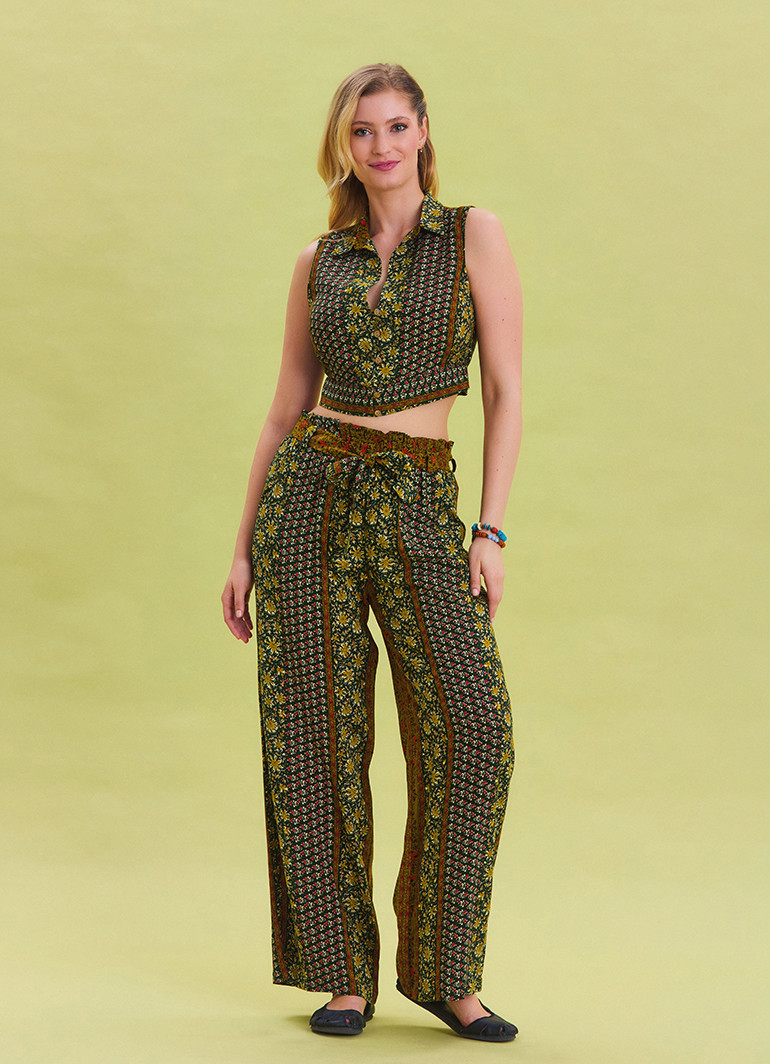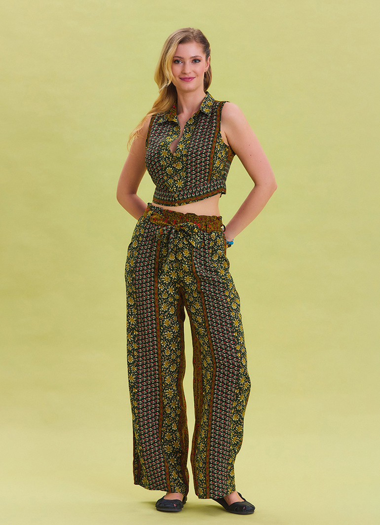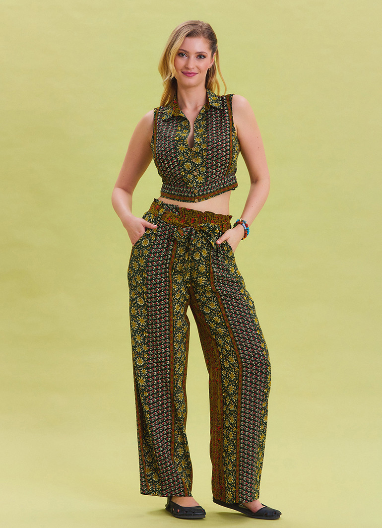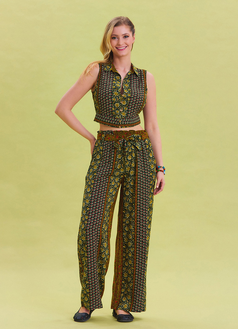 Modern ve zarif bir tasarıma sahip olan bu pantolon, beli lastikli ve kuşak detaylı tasarımıyla vücuda tam oturur. Bol paça modeli ise hareket özgürlüğü sunar ve şıklığınızı tamamlar.