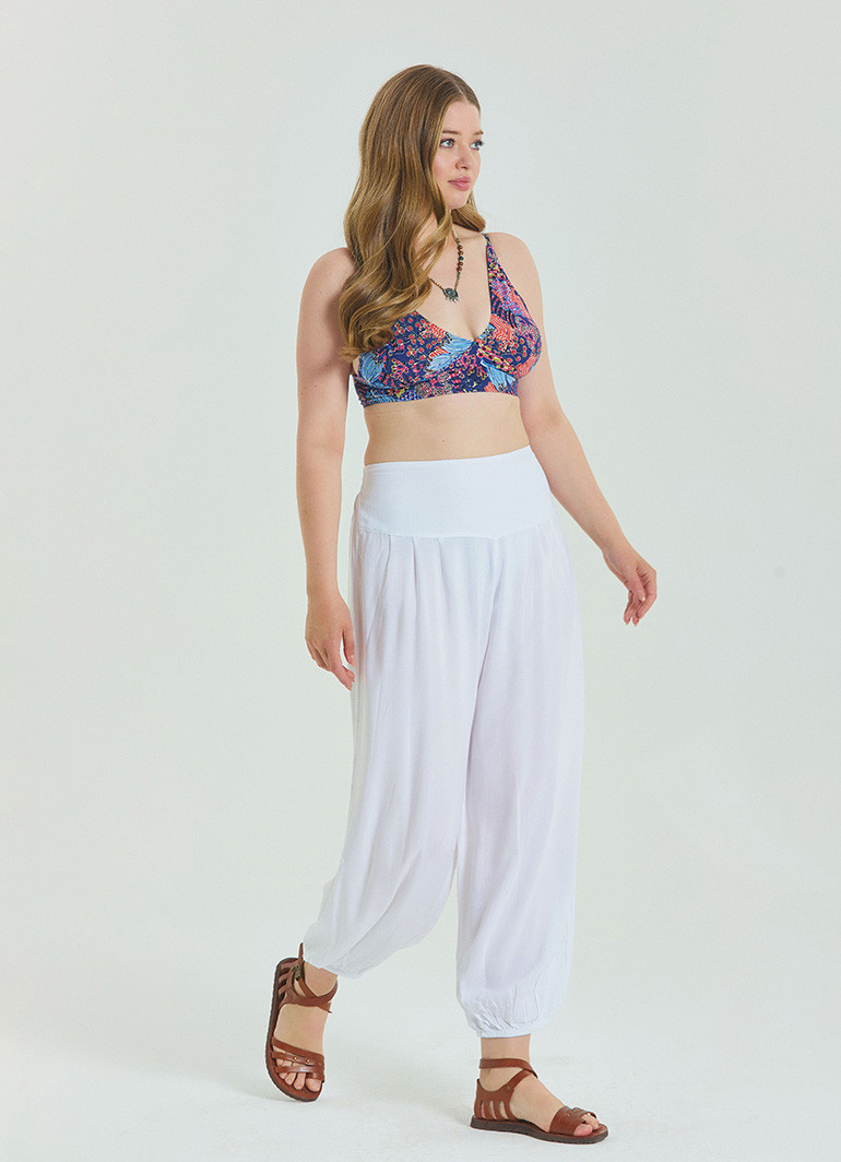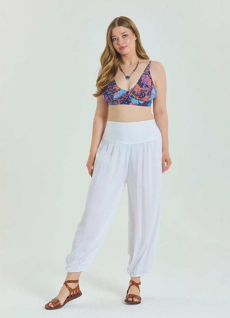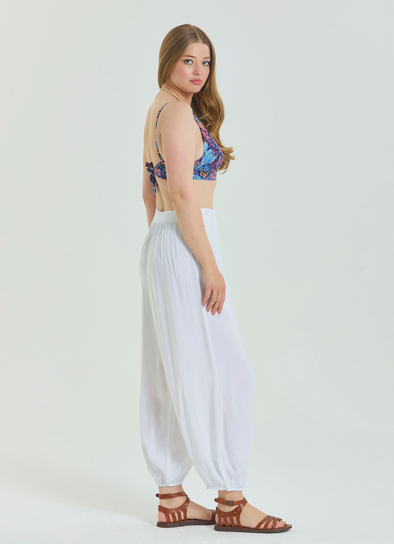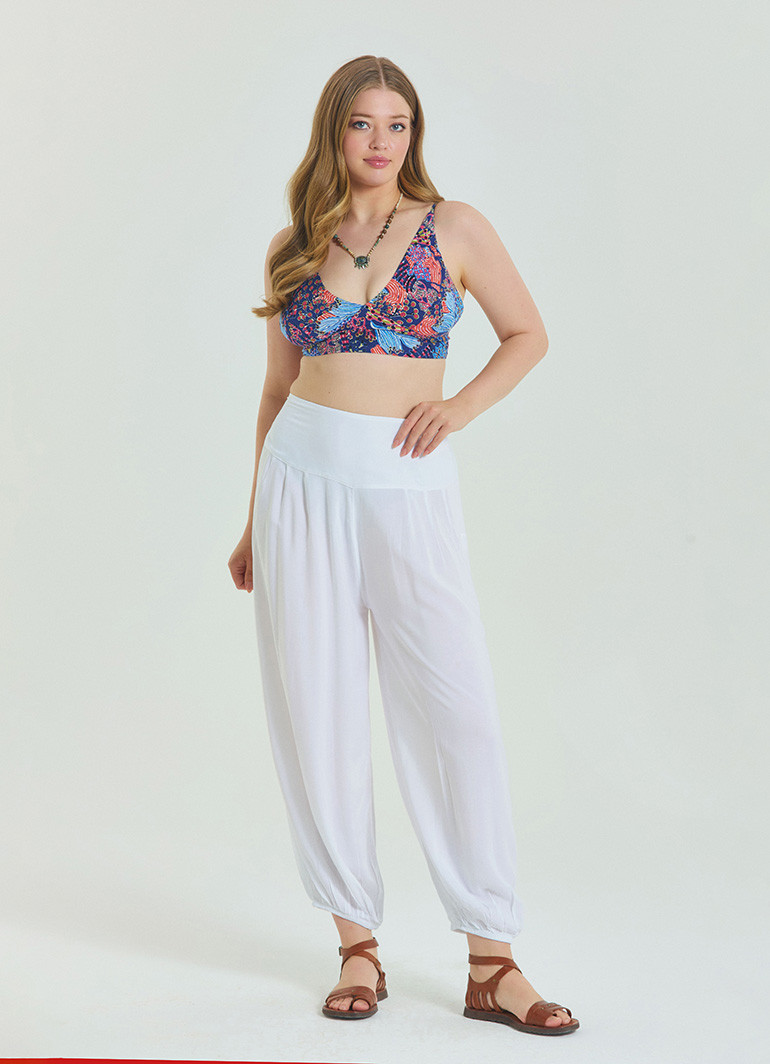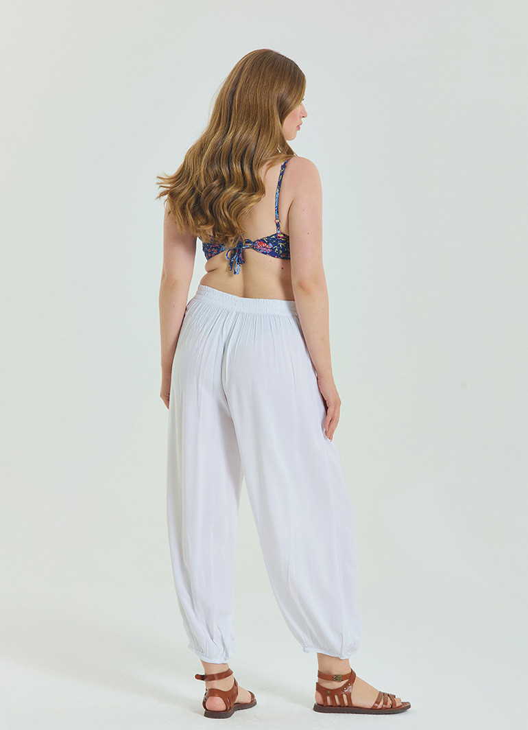 Yaz mevsiminde konfor ve şıklığı bir arada sunan bu beyaz büyük beden pantolon, rahat kesimi ve beli lastikli yapısıyla gün boyu özgürce hareket etmenizi sağlar.